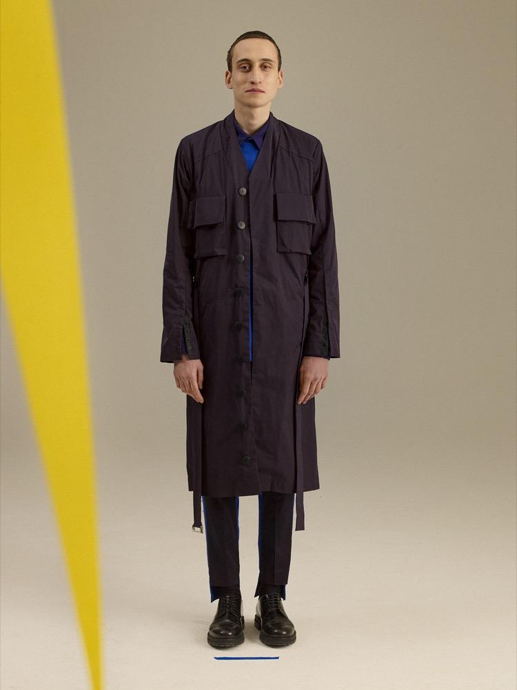 A kollekció másik sajátosságát a MEI KAWA-ra jellemző technikás szabászati megoldások adják. A nagyvonalú anyagráhajtások különleges sokszögletű formákat hoznak létre, vagy a rejtett gombvonalakkal például teljesen elemeire bontható uniszex kabátot is találunk a ruhák között. A túlnyomórészt pamutvászon és jersey anyagok mellett megjelenik egy rendkívül nom szövésű, enyhén fénylő textília, és egy különleges vízlepergető kabátanyag is.