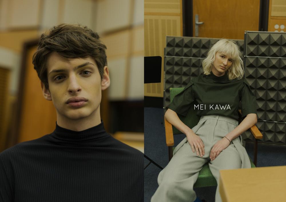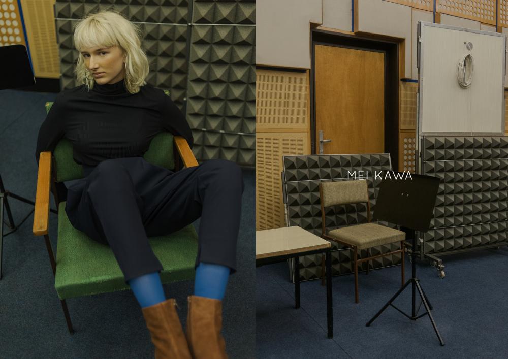 A kampányban bemutatott rádiószobát a hang karaktere alakítja, a stúdió játékos geometriája a hangszigetelés szabályai mentén épült ki. A tüskés panelek, és a kazettás borítású falak funkcionális megfontolásokból határolják a teret, de mégis a játékosság érzetét keltik. Hasonlóan viselkednek a ruhák is a modelleken – csupa éles hajtás, szabászati kontroll jellemzi őket, de mindenhol kibukkan egy-egy váratlan részlet. A mély sliccelések, és a jelzésszerű hasítékok jellemző elemek a MEI KAWA ruhákon, amit az idei téli kollekció az ultranőies, nyakék jellegű kivágásokkal fejleszt tovább.