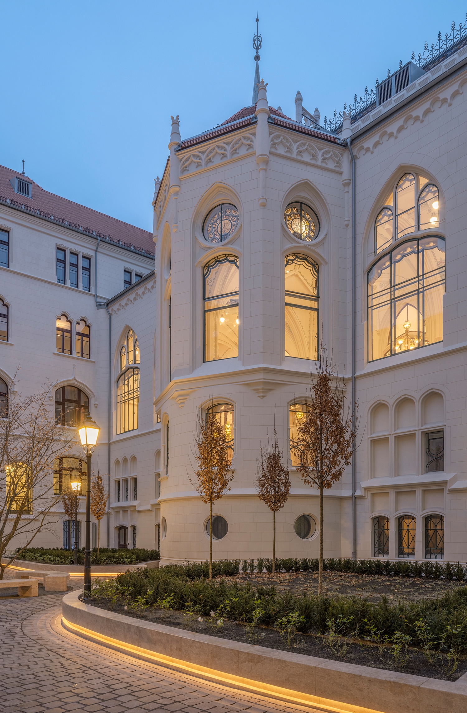 Ezért tűnhet fel, hogy a Fortuna-házzal szomszédos szárnyaknak kontyolt a teteje a korábbi befejezetlenség helyett. A szemfülesek pedig azt is észreveszik, hogy maga a Fortuna korábbi új tetejét használtabb cserepekkel és magasabb tetővel látjuk viszont. Utóbbi oka, hogy az Arch-Studio egy nagyon modern irodarészt tervezett alá. A legradikálisabb különbség azonban természetesen az áttört toronysisak-pár a főhomlokzaton. A bécsi Maria am Gestade tornyáról mintázott forma Fellner eredeti terve szerint is áttört lett volna. Itt kanyarodom vissza a feljebb említett kérdéskörhöz, miszerint a tervek fennmaradása olykor nem fontosabb forrás az archív fotóknál.