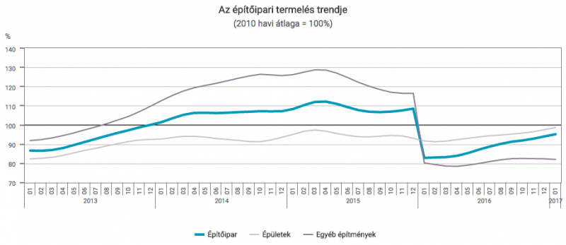 2017 januárjában az építőipari termelés volumene 18,5%-kal haladta meg az egy évvel korábbi alacsony bázist.