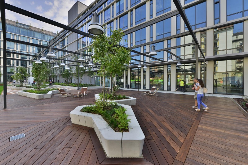 Ami igazán felejthetetlenné teszi ezt az épületet, az az 5500 négyzetméteres kert, ami az irodaházak világában egyedülálló koncepció.