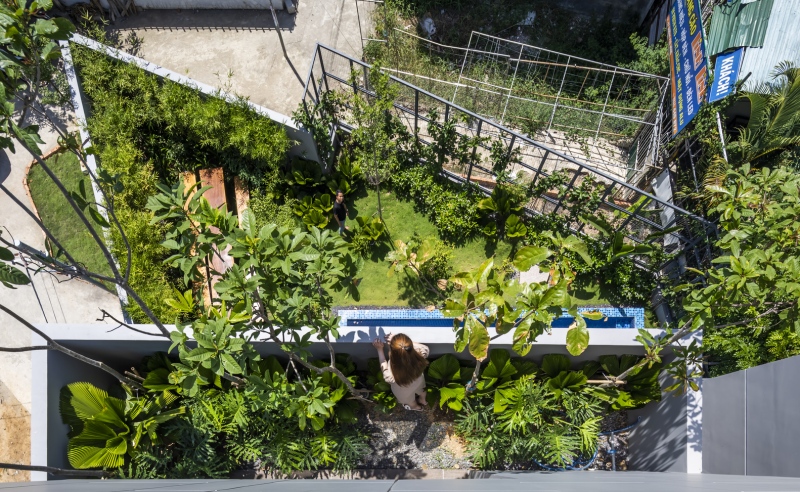 Burjánzó, zöld növénytakaró uralja a vietnámi családi otthont.