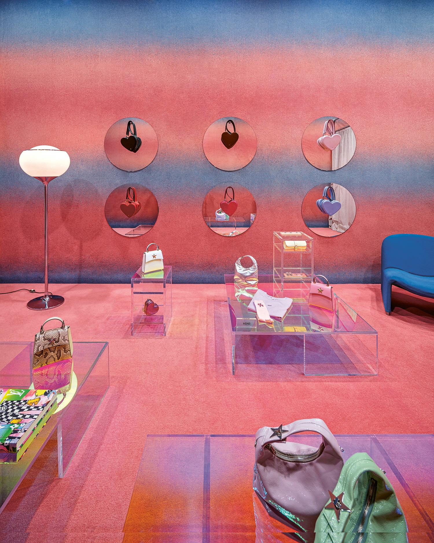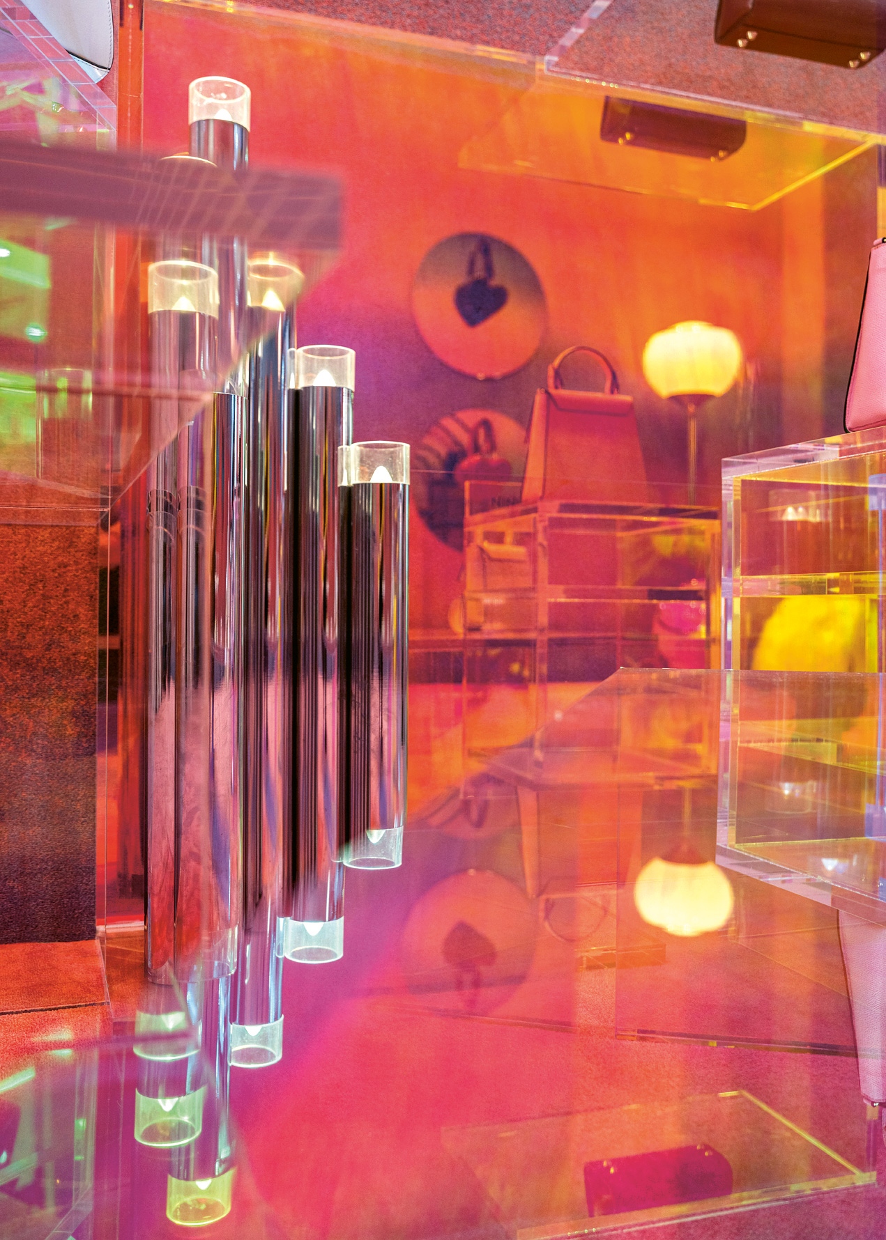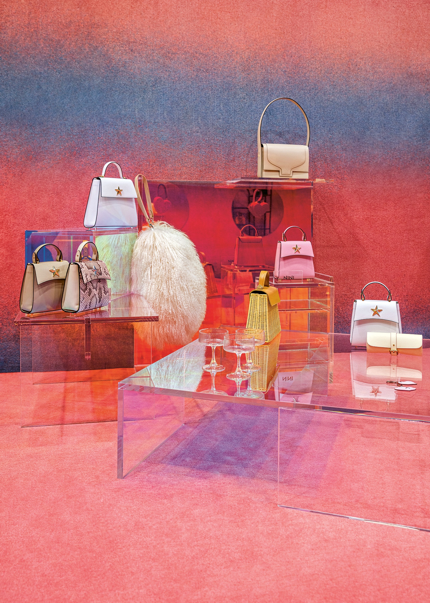 Dobár Éva a sikeres sportolói múlt mellett belekóstolt a modell szakmába is, mielőtt a belsőépítészet került a fókuszába. A NINI egy táskák és kiegészítők készítésére specializálódott hazai divatmárka, aminek pop-up butikjában a kiállított tárgyak vonzzák a tekintettet, miközben feltűnő, nőies atmoszférát teremtenek a pink, narancs, kék színek átmenetes derengése a falakon, ami egyfajta festői hatást kelt.