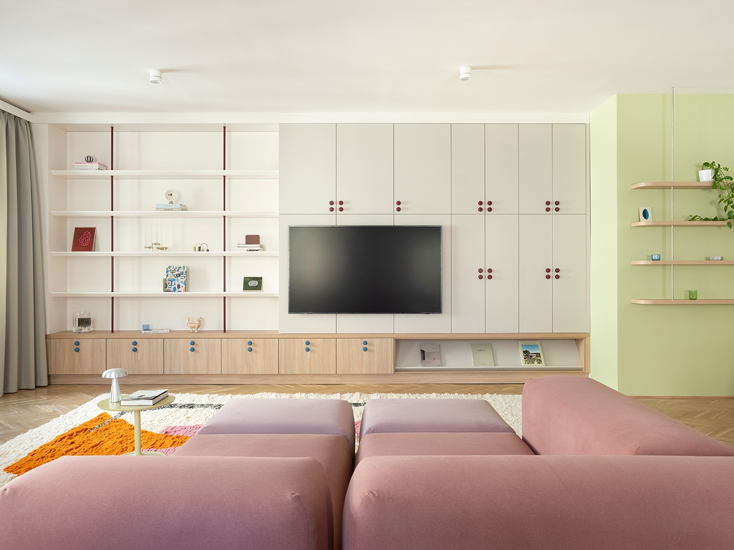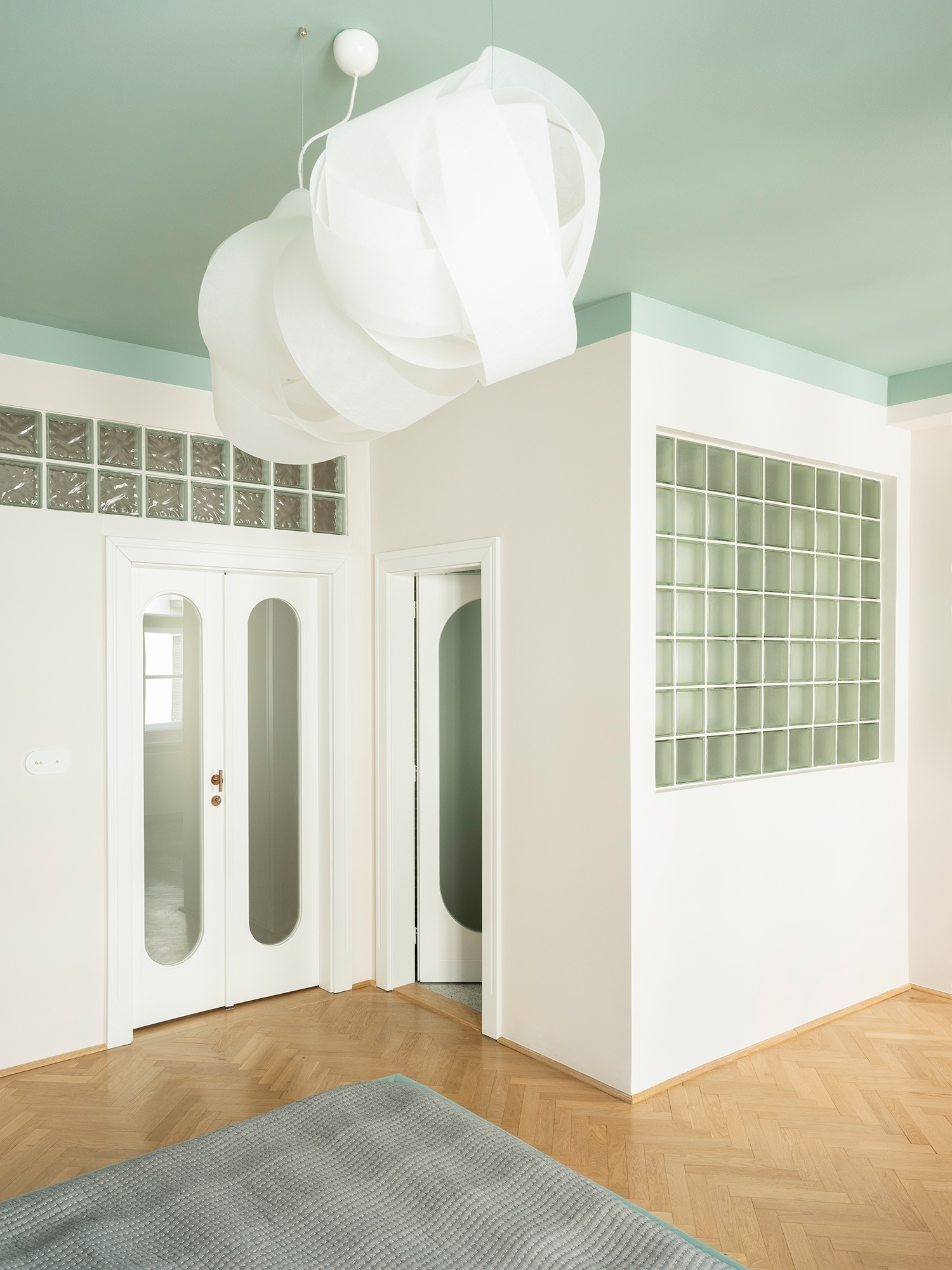 A két főtér közös „lélegzetvétele” új hierarchiát hoz létre. A nappali kiemelt pontján kialakított dolgozóállomás a megrendelő szakmai fókuszához igazodik, természetesen simul a kompozícióba. A LumoConcept függesztett lámpájának ívei rímelnek a felső szekrény lekerekített fogantyúira; az ismétlődő ívek és félkörök szinte teljesen kiszorítják az éles sarkokat, suhanó mozgásérzetet generálva. A múlt felé nyúló gesztus a parketta megmentése, ahol méretre újragyártott, kiegészített, javított elemek illeszkednek az eredetibe.