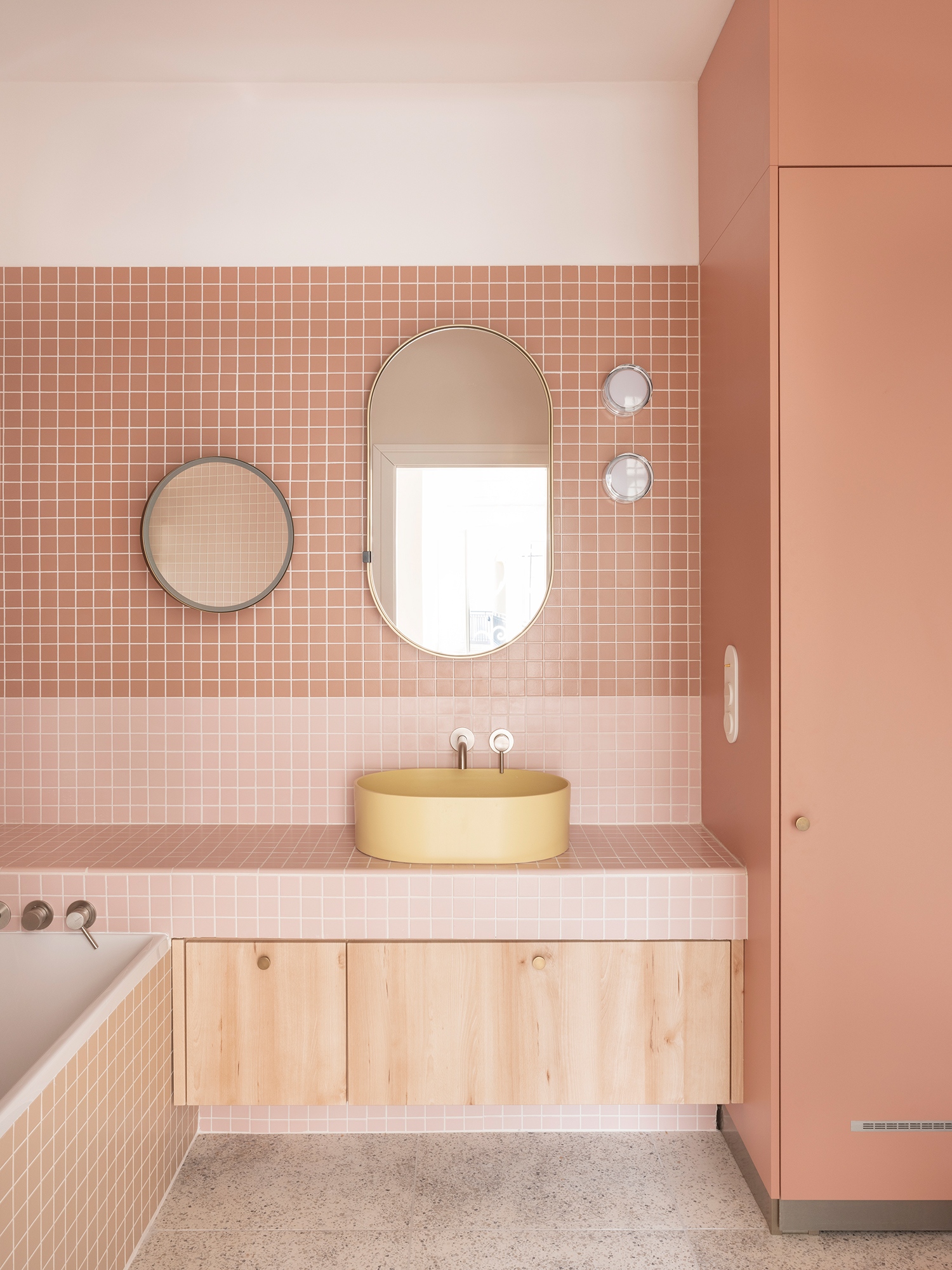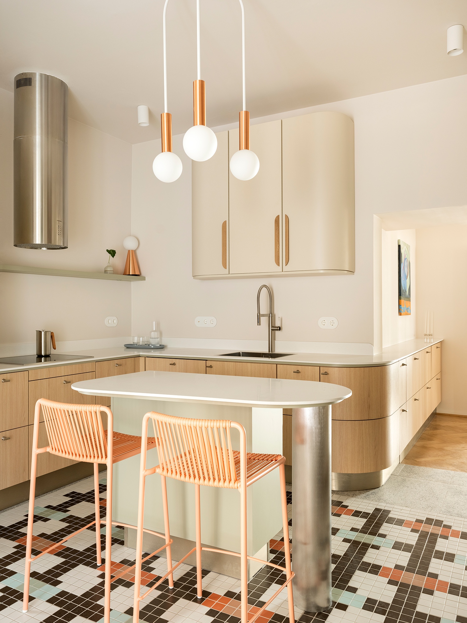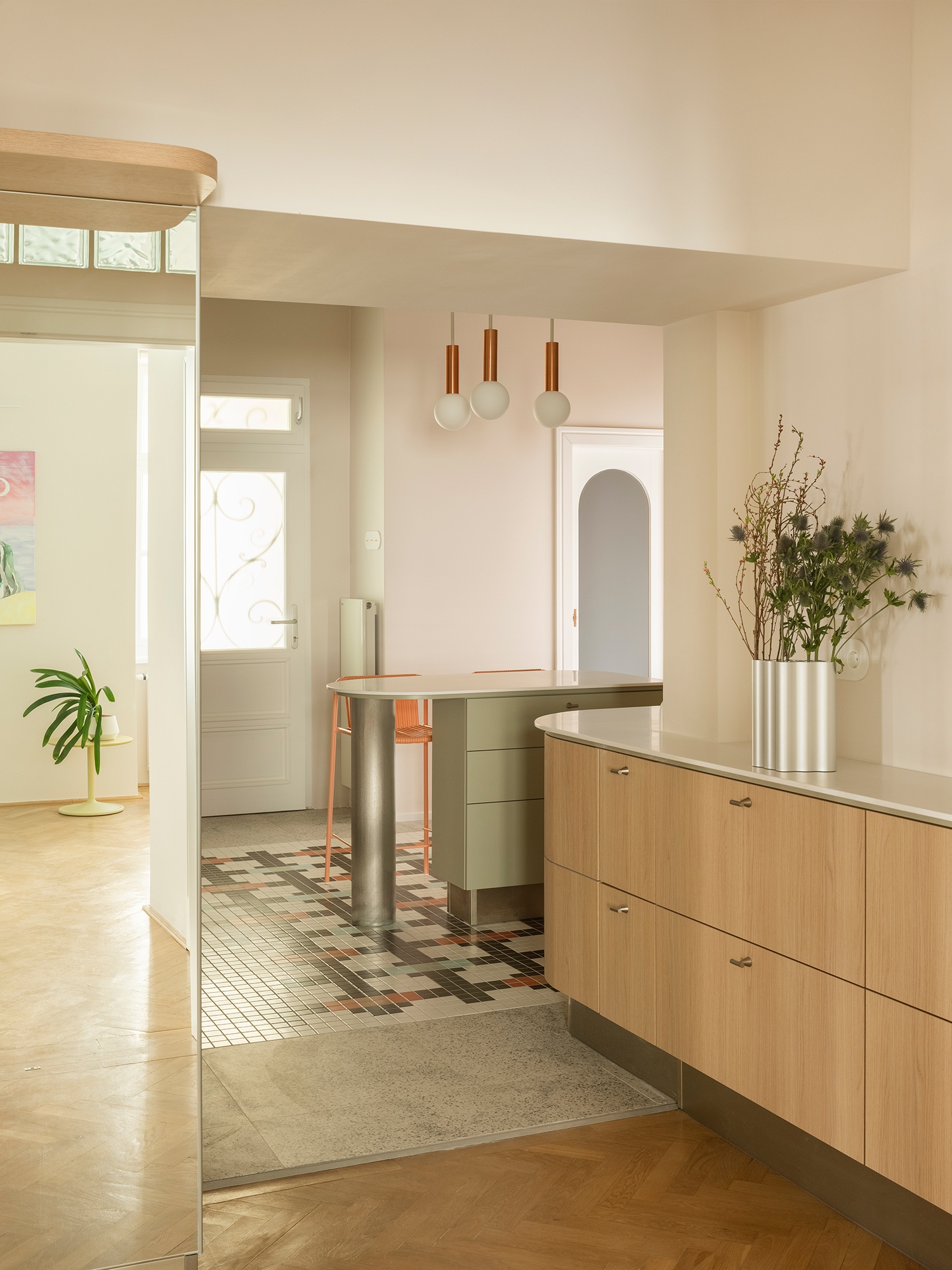 A koncepció alapja ezért nem a radikális bontás, hanem az „áramoltatás” lett: a határok oldása és a funkciók egymásba úsztatása. A konyha és a nappali között elmosódó zóna felszámolja a korábbi lineáris közlekedést; a folyosó szerepe feloldódik a fényt továbbító tükrökben, az üvegtéglák szelíden szűrt fényében és a szőnyegszerűen kifutó mozaikpadlóban. Saját grafika kódolódik a kisméretű csempék rendszerébe, már a belépéskor vizuális pályára állítva az érkezőt. Olyan, mintha városi kavicsréteget terítettek volna le: áttételes utalás kint és bent párhuzamára.