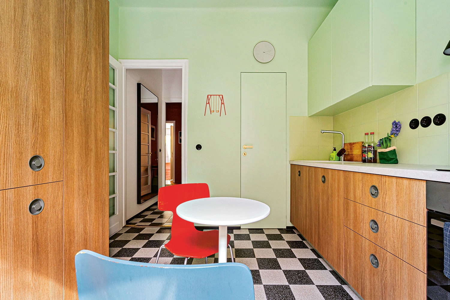 A felújítás szigorúan tiszteletben tartotta az eredeti modernista részleteket. A felújított nyílászárók és karcsú kilincsek megmaradtak, a falak lábazatát fekete festés hangsúlyozza, a konyha és a fürdő sakktáblamintás terrazzo burkolatot kapott, fölöttük 20×20-as fehér csempe idézi a háború utáni funkcionalizmust. A Berker Serie 1930 kerek, fekete kapcsolói apró, grafikus ékszerként emelik ki a Bauhaus örökséget. A hangulat kulcsszereplői a mid century bútorok: a gondosan felújított '60-as, '70-es évekbeli fotelek és az egyedi tervezésű konyhabútor finom párbeszédet teremtenek múlt és jelen között. Utóbbi laminált felülete, rejtett fogantyúi és a kredenc zöld falba simuló felső elemei a klasszikus konyhakredenc hangulatát idézik, miközben naprakész funkcionalitást biztosítanak.