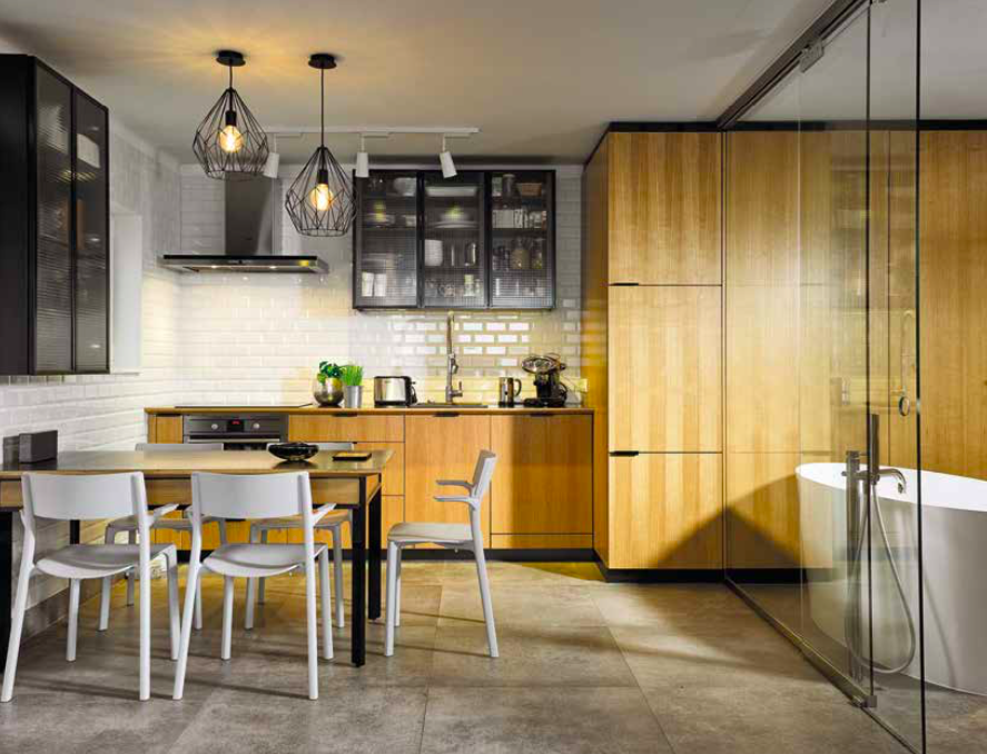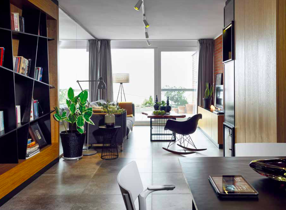 Ez utóbbira „két fő táncost” (pas de deux) is láthatunk ebben a téri történetben. Ugyanis a kissé skandináv jellegű, de részleteiben egyúttal iparias ízű, a korábbi válaszfalak lebontásával alapvetően kéttraktusossá lett a lakásban, a fürdőszobát és a háló terét, valamint a konyha, illetve az azt követő étkező és nappali részeket üvegfalakkal határolt kád (!), valamint az aszimmetrikus polcosztású, szemrevaló, vérbő dekonstruktív darab: a könyvespolc választja el egymástól.