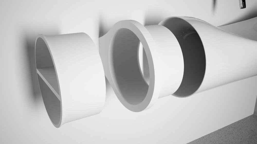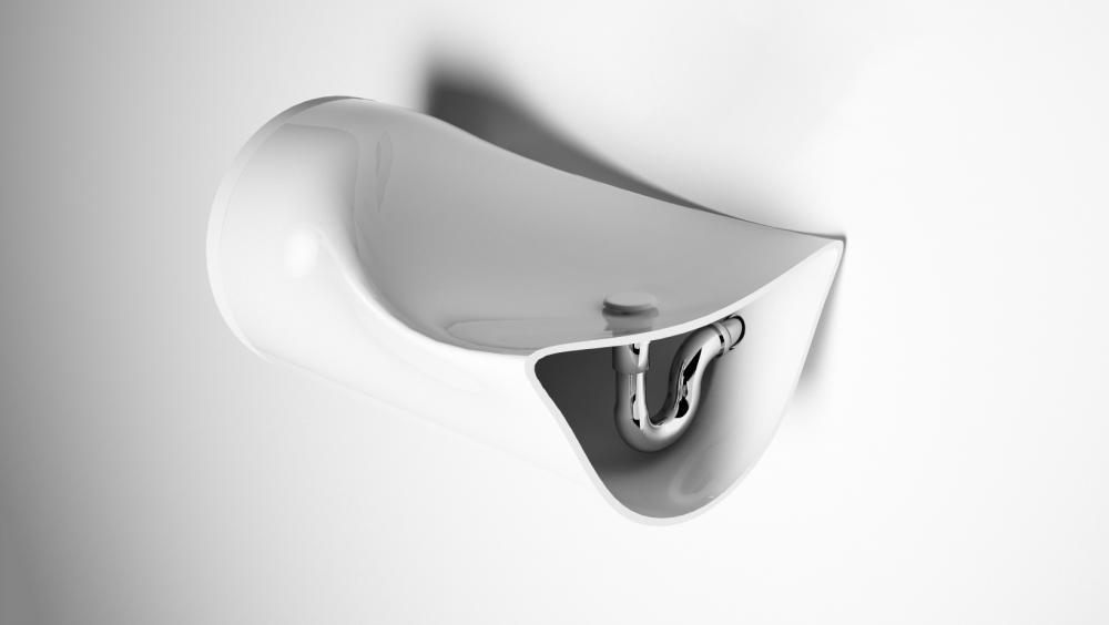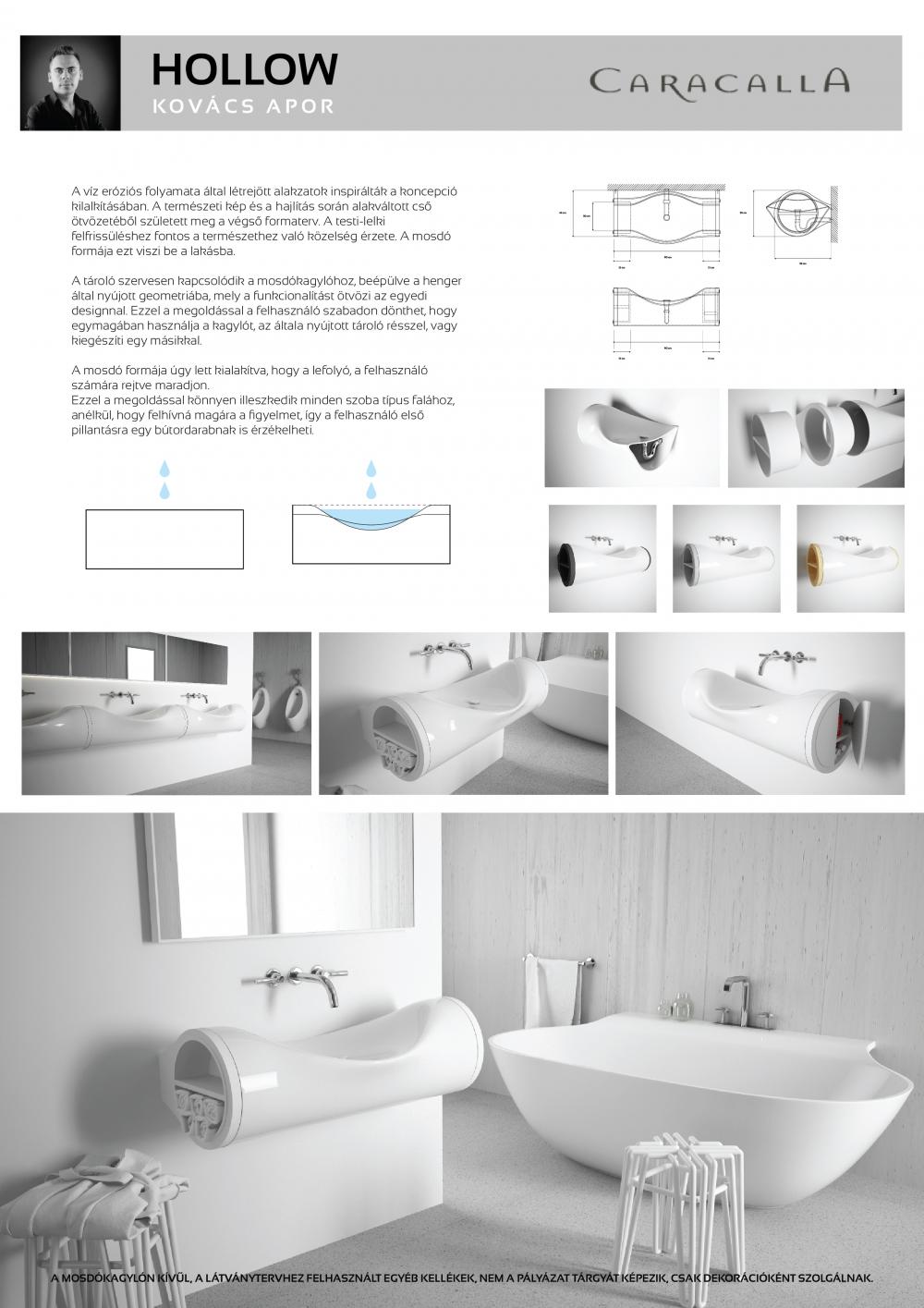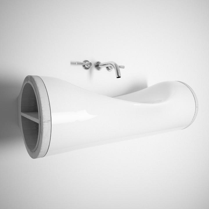 Kovács Aport a víz eróziós folyamata által létrejött alakzatok inspirálták a koncepció kilalkításában. A természeti kép és a hajlítás során alakváltott cső ötvözetéből született meg a végső formaterv. A testi-lelki felfrissüléshez fontos a természethez való közelség érzete. A mosdó formája ezt viszi be a lakásba.