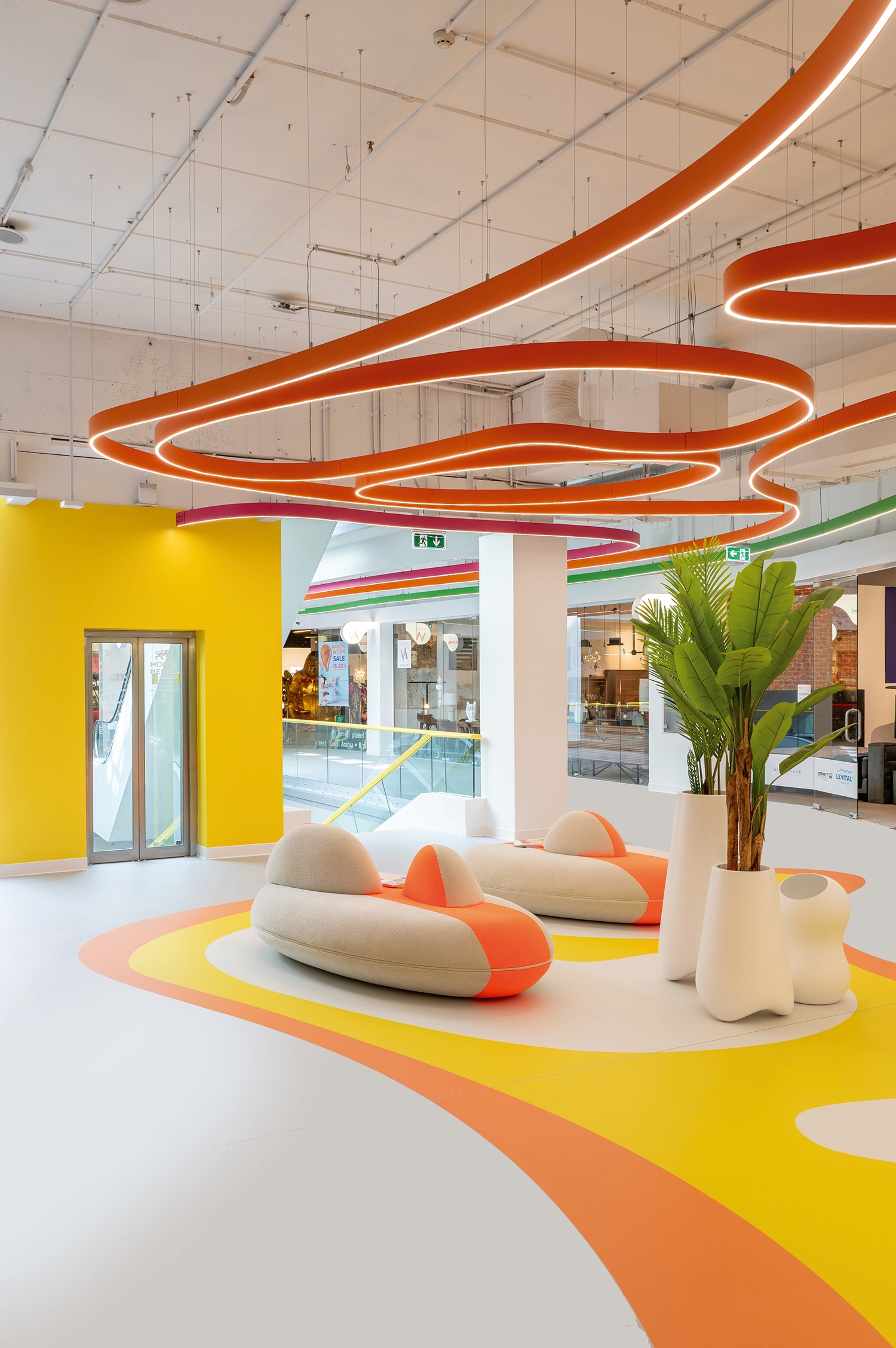 A falfelületek és a pillérek világosabbak lettek, a nagy átlátások kitágították az amúgy sem kuporian használt tereket. Meghökkentő formájú, ám roppant praktikus, csalogató bútorok és világítótestek kísérik felfedezőútján a vásárlót, ahogy az irányfények, a más és más színű ledlámpa-csíkok sem csupán a tájékozódást segítik. (Zárójelben, érdekességként szükségesnek tartjuk megemlíteni, hogy a színes irányfényeket eredetileg a padlóba tervezték ültetni, végül – praktikus okokból –, 180 fokkal elforgatva a terveket, kerültek a nyitott födém alá.)