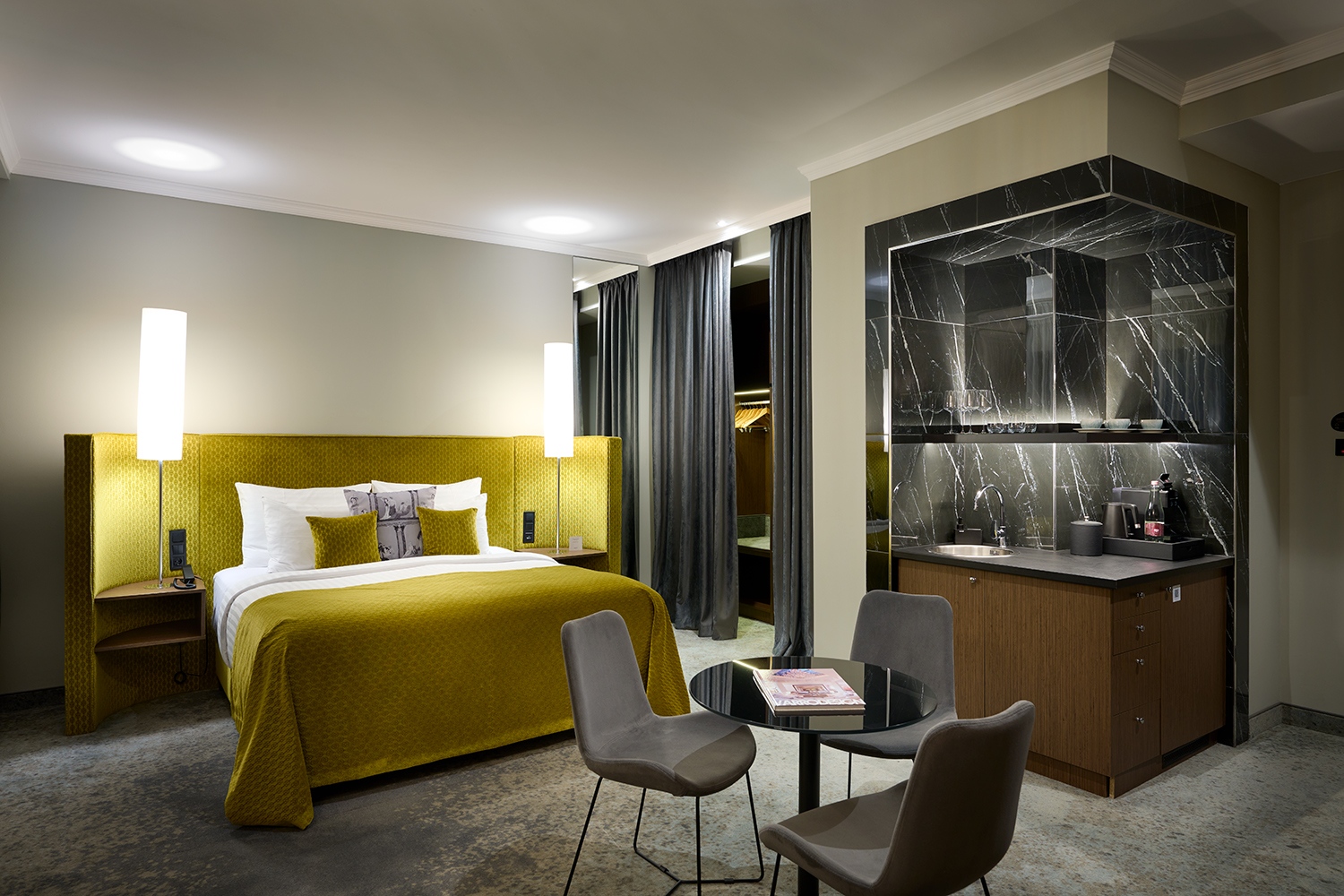 100 méterrel arrébb tehát csábító lehetőségként kínálkozik, mivel ugyanúgy a Lánchíd mellett van, de még közelebb a Deák Ferenc térhez. A brand a CPI Hotels Mamaison Collection nevezetű, 4-5 csillagos családjába tartozik, a kiválasztott épület pedig egykor a Pesti Kereskedelmi Bank épülete volt és Münnich Aladár tervezte 1937-ben. A rigorózus stílus, és a hozzá illő funkció után, az 1930-as évek egyik bohém világát becsempészni szálláshelyként érdekes kontraszt, és talán ez a tervezői feladat legérdekesebb problematikája is egyben.
