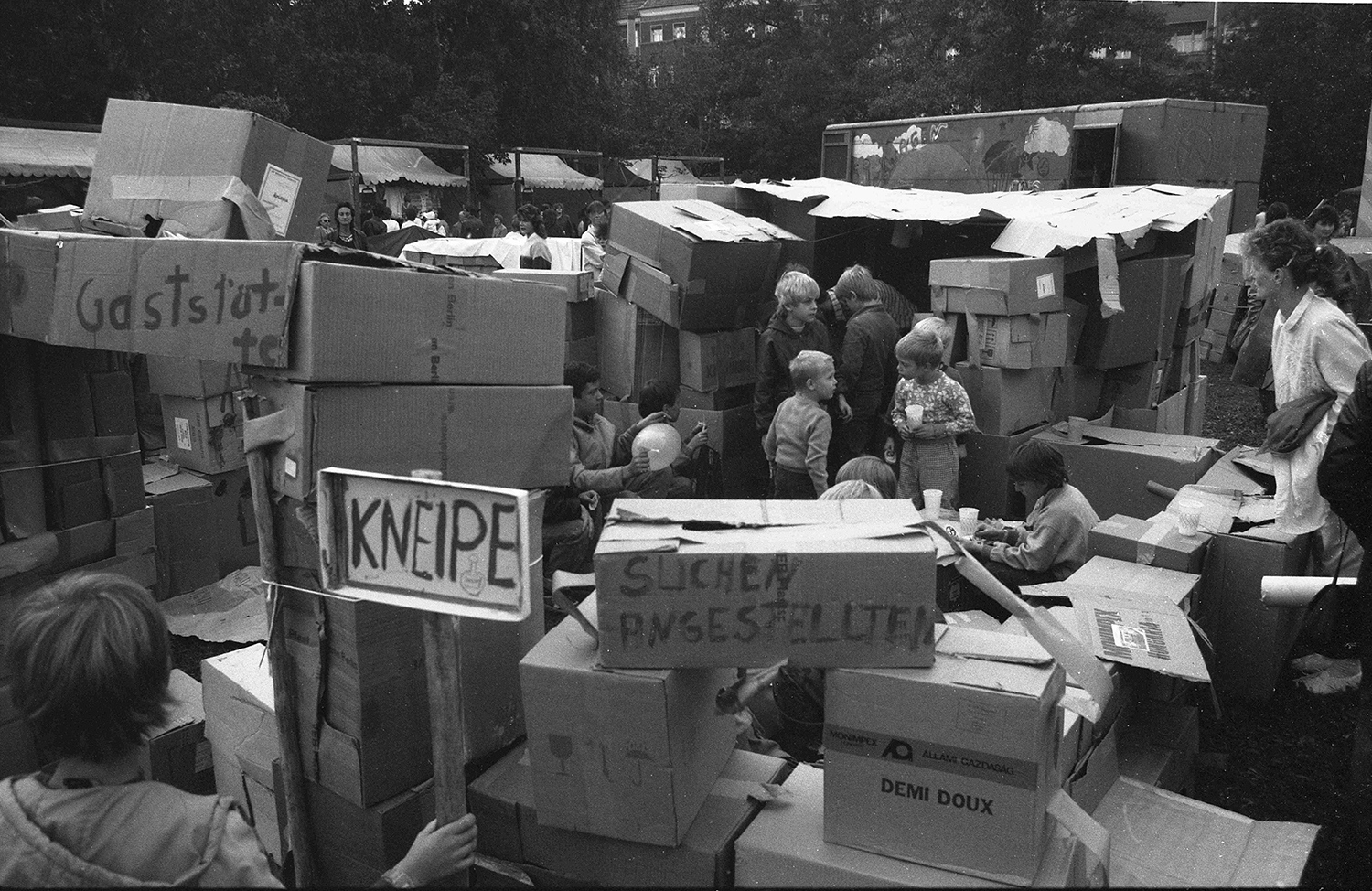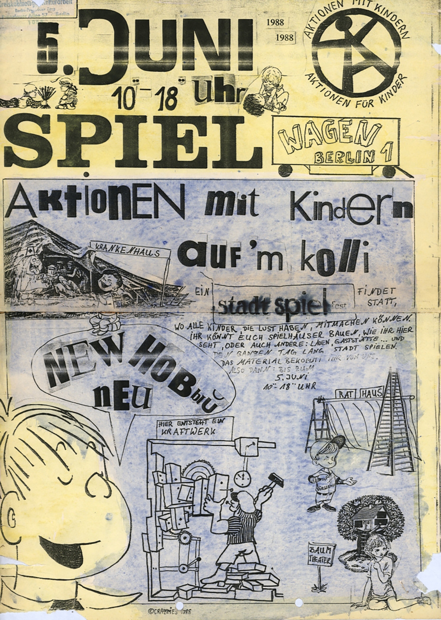 A kollektíva 1985-ben Spielwagen Berlin 1-re és Spielwagen Berlin 2-re vált szét. Míg a Spielwagen Berlin 2 inkább a színházi játékra helyezte a hangsúlyt, addig a jelen kiállítás középpontjában álló Spielwagen Berlin 1 olyan, elsősorban téralkotásra épülő formátumokat fejlesztett ki, mint például a Stadtspiel [városjáték], amelynek keretében a gyerekek közösen kartonból és deszkákból városokat építettek, és demokratikus folyamatokat „játszottak el” közterületen. Ezek a kísérleti, utópia-építési gyakorlatok a kelet-német kommunista rezsim utolsó éveiben, még mindig szigorúan ellenőrzött politikai környezetben zajlottak. A forradalom és az újraegyesítés új lehetőségeket nyitott a csoport számára, és teret adott a professzionalizálódásnak. A Spielwagen Berlin 1 tagjai, társadalmi felelősségvállaláson, helyi cselekvésen és részvételi demokrácián alapuló politikai eszméiket megtestesítendő, 1990 elején megalapították a Netzwerk Spiel/Kultur Prenzlauer Berg nevű egyesületet, amely máig meghatározó szereplője Berlin gyermek- és ifjúsági ellátórendszerének.