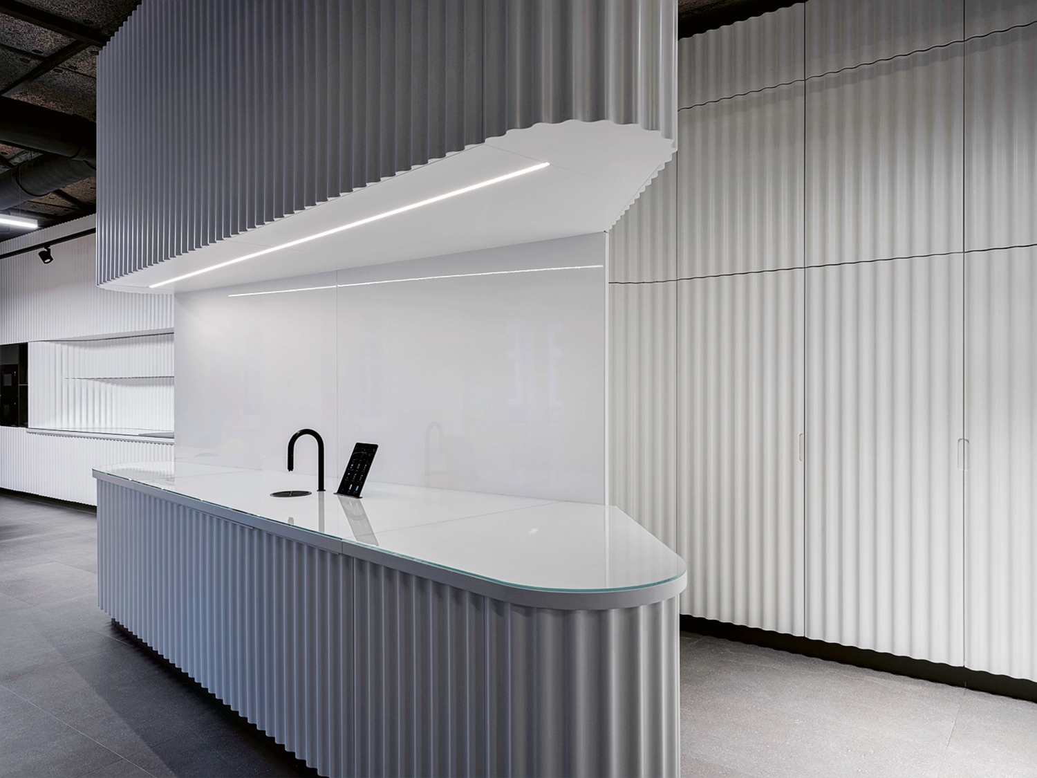 A belső tériség léptékváltása azonban nem pusztán az összenyitások révén áramló terek dinamikáján látszik. Úgy vélem, hogy erre az áramlásra erősít rá a falakat borító hullámlemez felszínének vonalvezetése, illetve a közösségi térként is funkcionáló étkező egyedi geometriájú étkezőasztala és a szinte kortárs épületszoborként ható, hófehér konyhapultjának hullámzó, fából mart felszíne is. Ezek a hullámok, redők rét-hasonlatunk frissességével, valami természetességgel, membránfinom rezgéssel töltik meg a stúdiót.