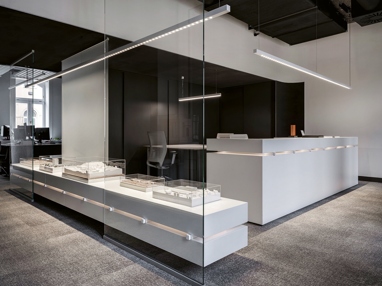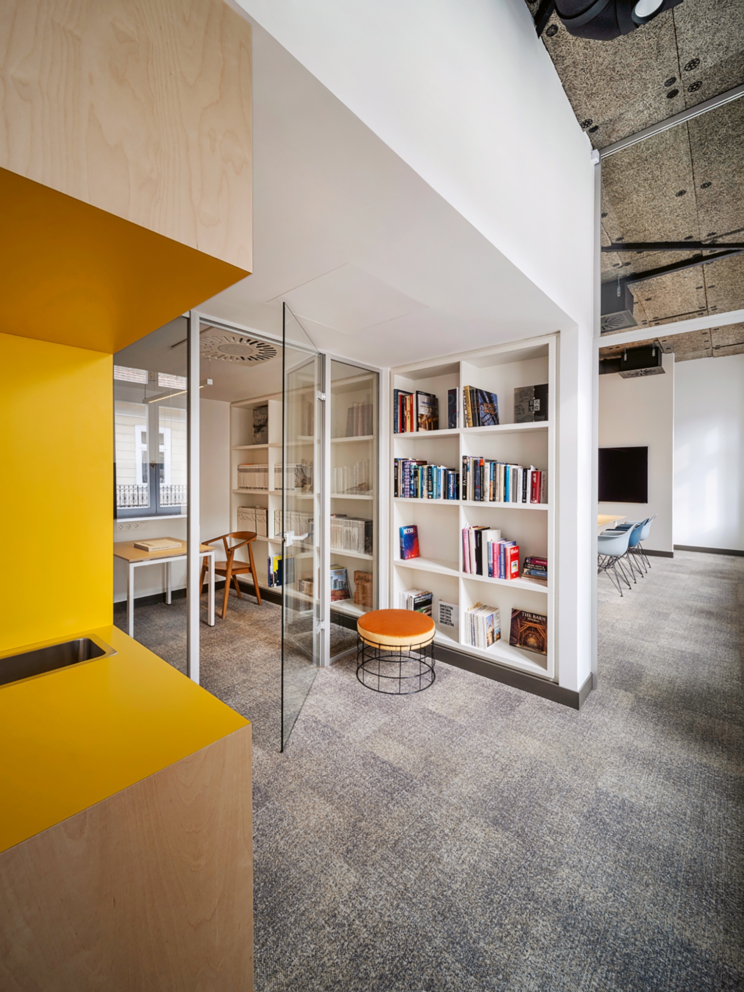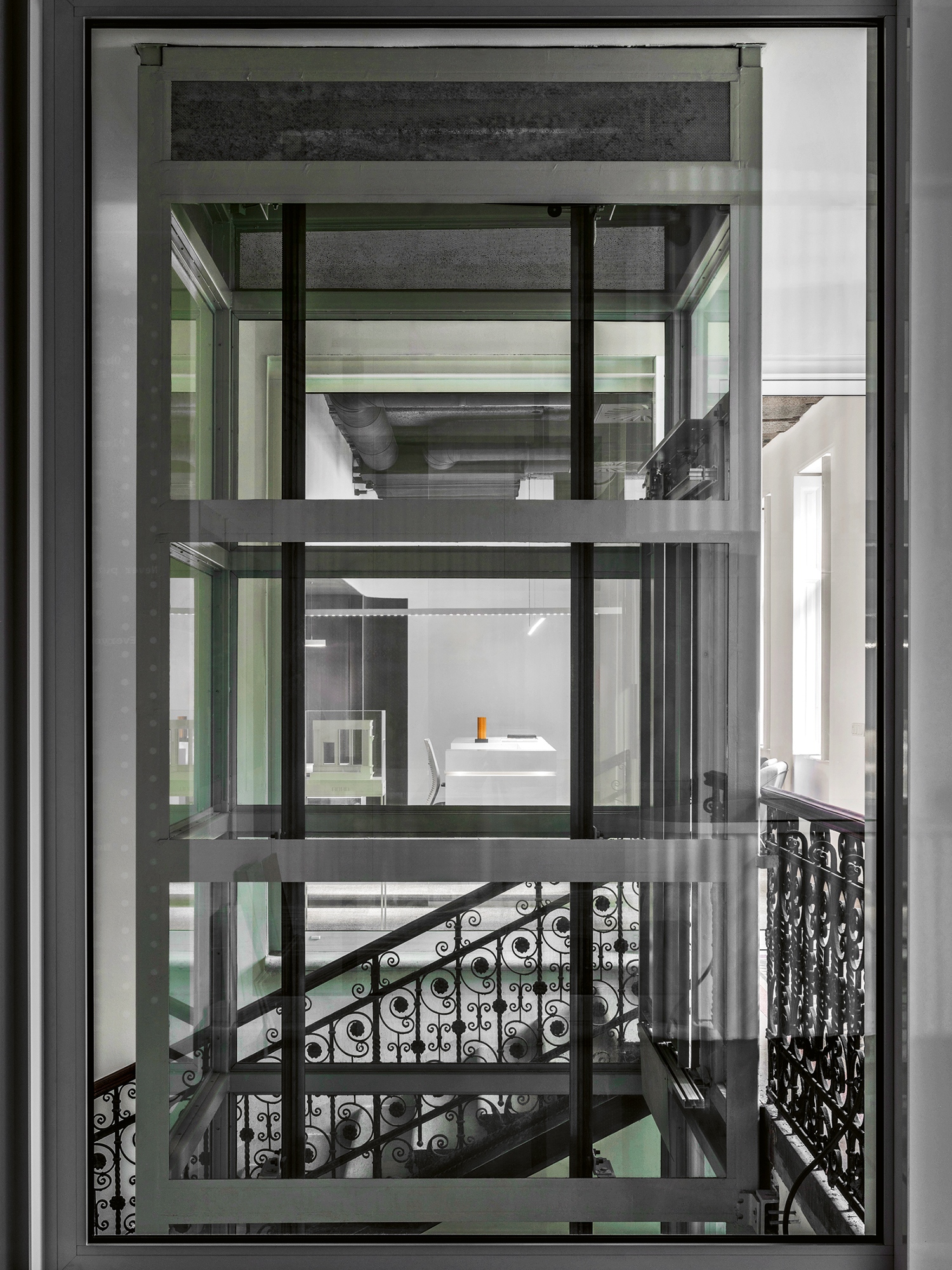 Számomra – a különféle rétegek belső arányainak megtalálása mellett – valódi kulcspozíciónak a lépcsőház legfelső lépcsőfordulójának acéltartókkal keretezett, üvegfalakkal megnyíló bejárati zónái hatnak. A lift előtere és az emeleten körbefutó irodakaréj két vége közötti optikai játék izgalmas átlátásokat eredményez az üvegfelületeken át, illetve a jobbra eső publikus ügyféltárgyaló részleget finoman képes összekötni a bal oldali privát munkatérrel, étkezővel. Az elmúlt években láthattunk néhány olyan üdítő belsőépítészeti megoldást, ami az eklektikus bérházak lakásaira jellemző polgári térsor alaprajzi rendszerét bontotta meg a közfalak elbontásával.