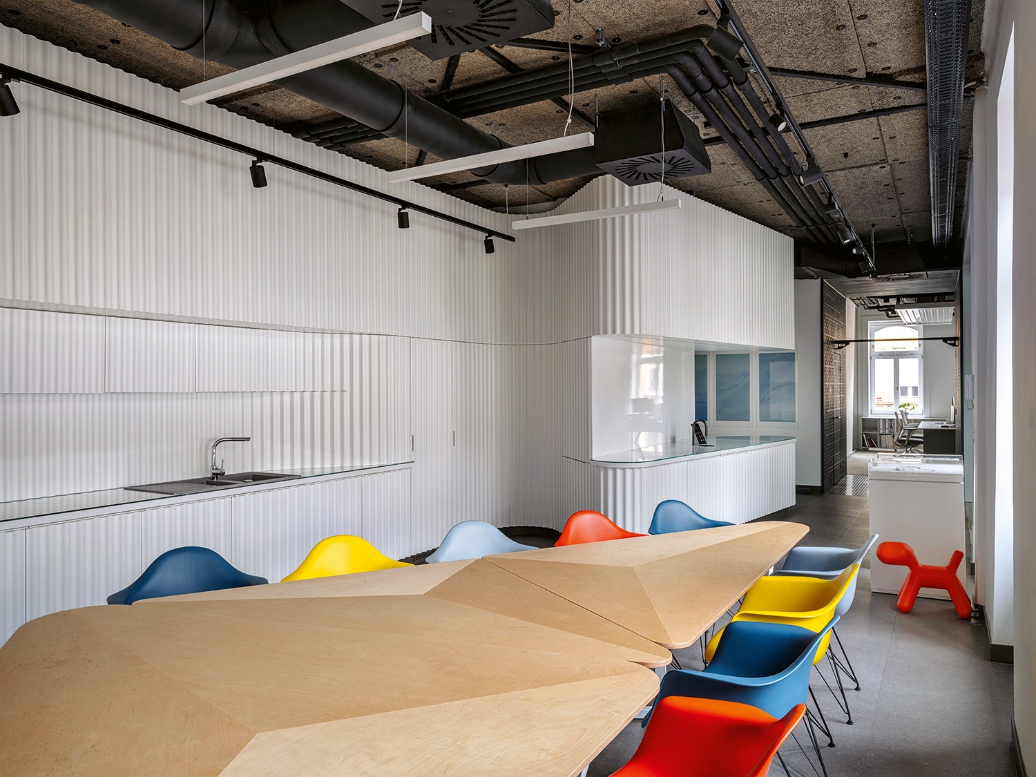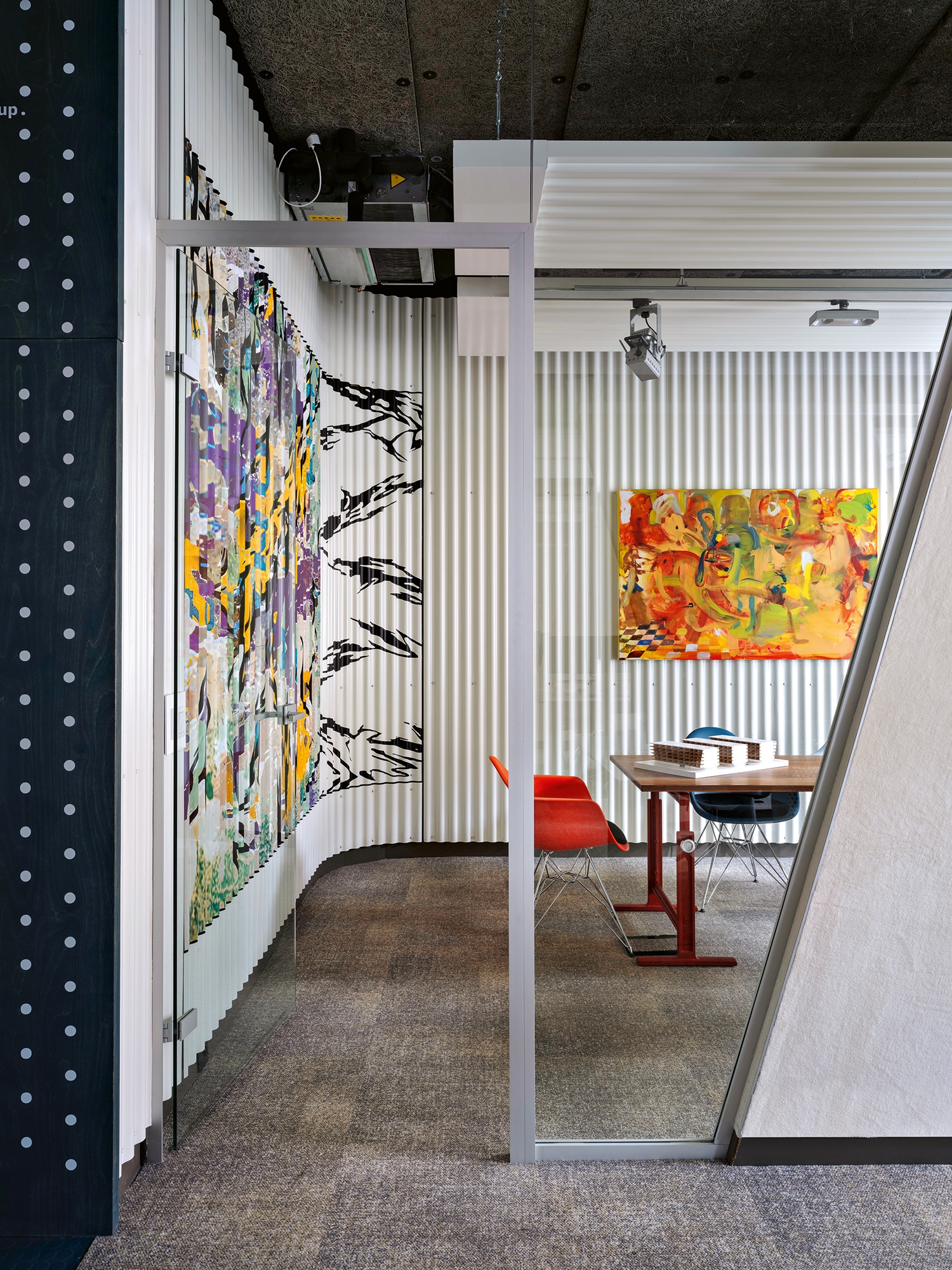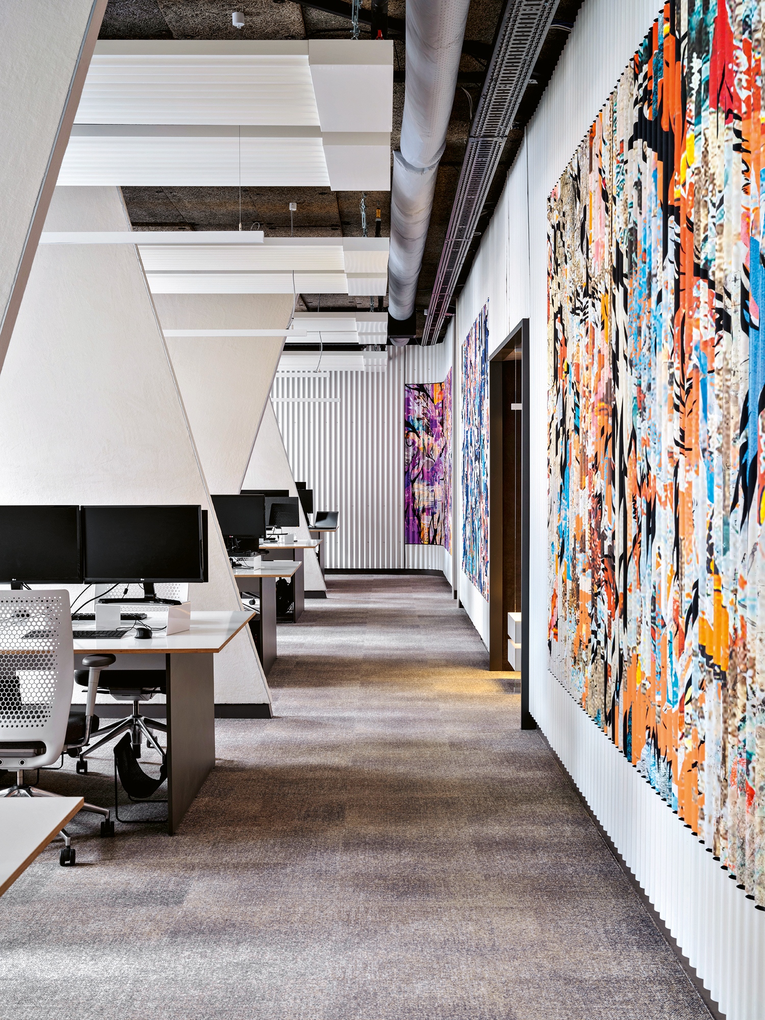 Így a nagy belmagasság nyújtotta téri kapacitás radikálisan változik meg, a belső tér léptéke szinte kitágul és egyfajta loft-szerű atmoszféra jelenik meg. Bordás Péterék ennél tovább lépve szinte tejesen új statikai viszonyokat komponáltak, aminek leglátványosabb eleme a szinte jelzésértékű pengefalakkal tagolt munkatér léptéktranszformációja. Ehhez a felszabadult, „loftos” tériséghez nem pusztán az álmennyezet elhagyásával a mennyezeten karakteresen megjelenő gépészeti elemek illeszkedhetnek, hanem az irodatér munkakarakterét erősítő hullámlemez falfedés, amin remekül működnek Dóczi Attila képzőművész kissé street art, kissé digitális comics, cyber falfestményei.