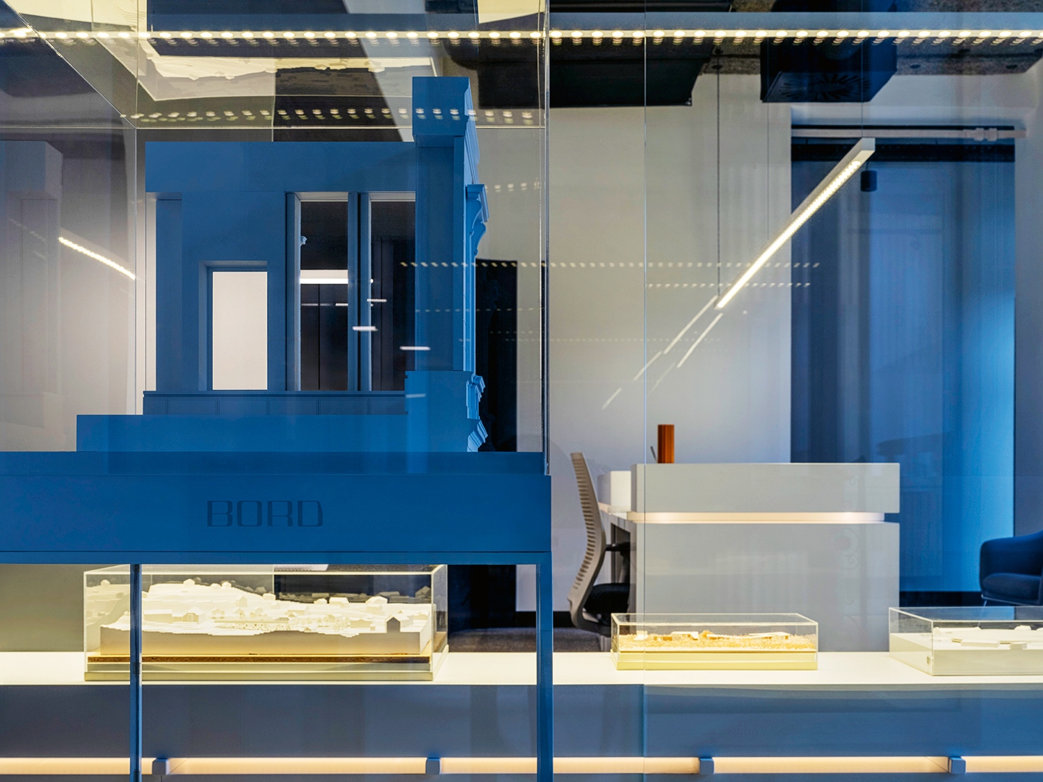 Ehhez képest tűnik csendesebbnek, tradicionálisabbnak a „tárgyaló-oldal” térrendszere, ami egyébként is az udvari szárny felé esik, tehát másféle adottságokkal bír, mint az utcai szárny. Itt a recepció pultja, egy szeparált kisebb tárgyaló és egy nagyobb tárgyaló fogadja a belépőket, akik a BORD Stúdió korábbi munkáinak épületmakettjeit is megtekinthetik.