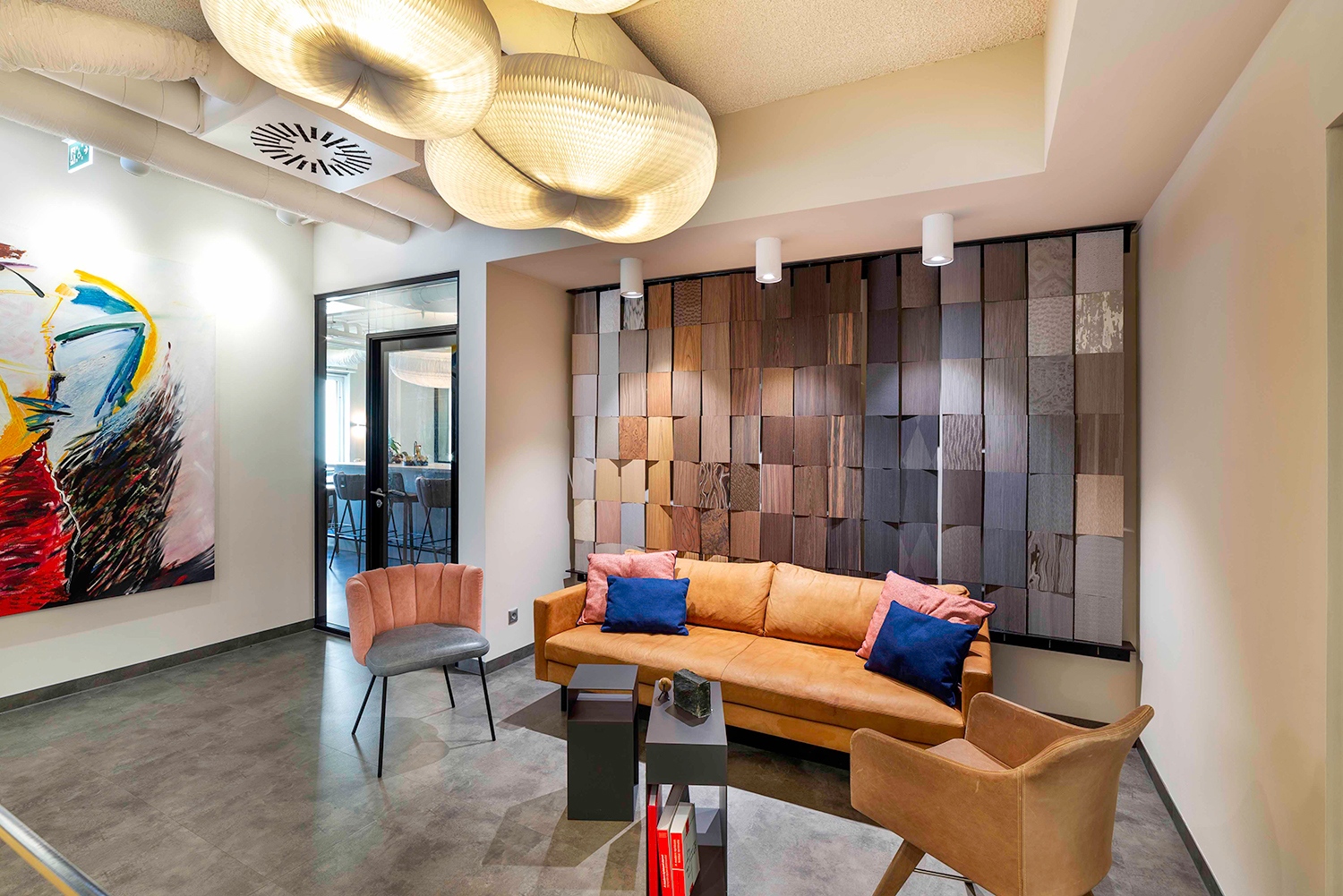 Az új iroda egyik legígéretesebb tere a közösségi tér egy egyedileg tervezett lelátóval, amely a teljes csapat befogadásra alkalmas, így egyszerre helyet ad csapatépítésnek, közös alkotásnak és prezentációknak. Az egyterű irodatérben a dolgozói és vezetői asztalokat vizuálisan papír alapanyagú MOLO térrács választja el, míg a korábbi játékszobából nagy tárgyaló és könyvtárszoba született. A nagy tárgyaló falán látható három festmény nem csupán dekoráció, hanem a közösségi élmény lenyomata. Láncos Áron, a stúdió vezető partnere elmondta, hogy a művek Gábor Áron festőművész vezetésével, egy közös alkotói workshop során születtek, ahol az iroda munkatársai saját kreatív energiáikat és gondolataikat vitték vászonra. Így a festmények egyszerre jelképezik az egyéni kifejezés szabadságát és a közösségi erő összhangját.