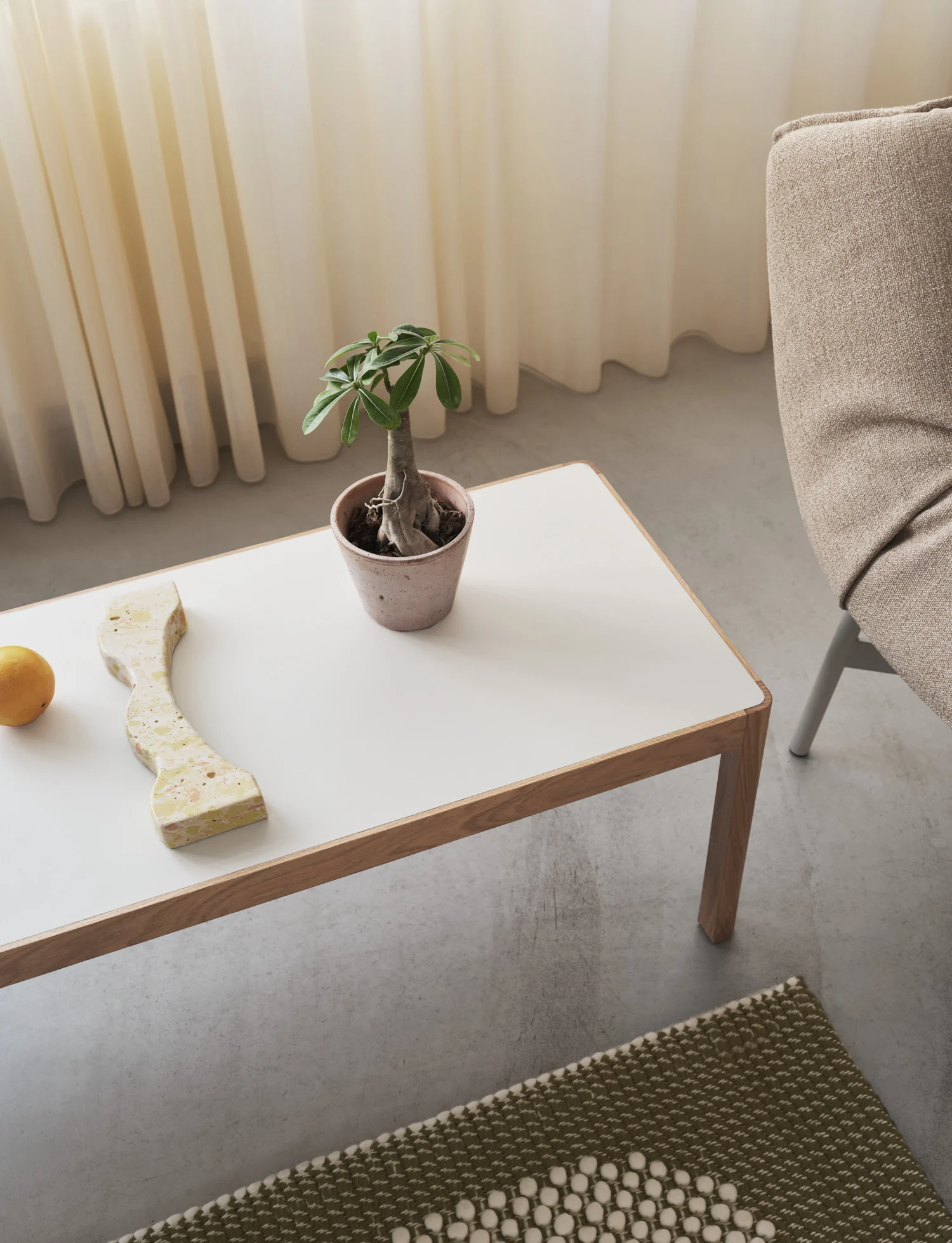 A Workshop dohányzóasztal a letisztult skandináv design nyelvét tükrözi könnyed és elegáns megjelenésével. 2023 tavaszán a tölgyfa alap melegsége a linóleum eleganciájával lép frigyre, a lágyan tapintható asztallap finoman merül el a tömör tölgyfa keretben.