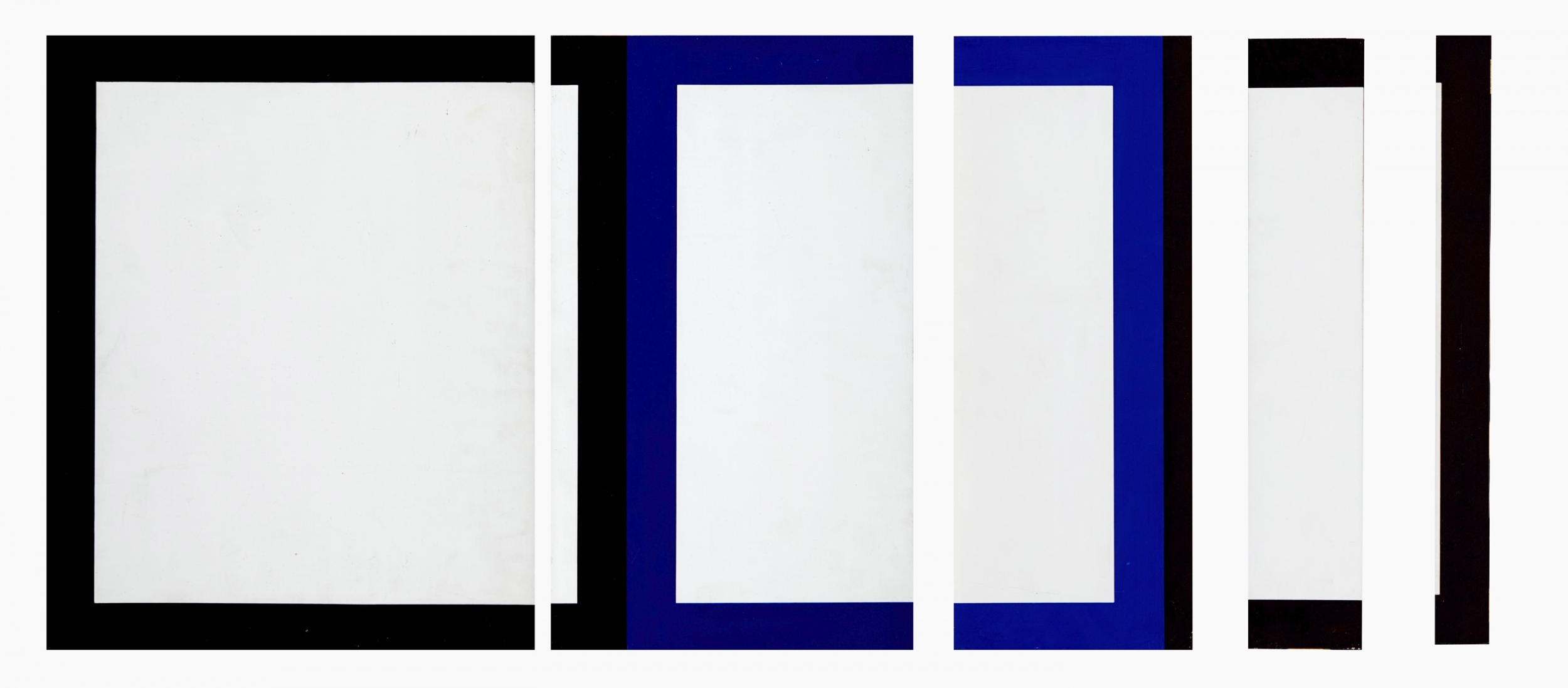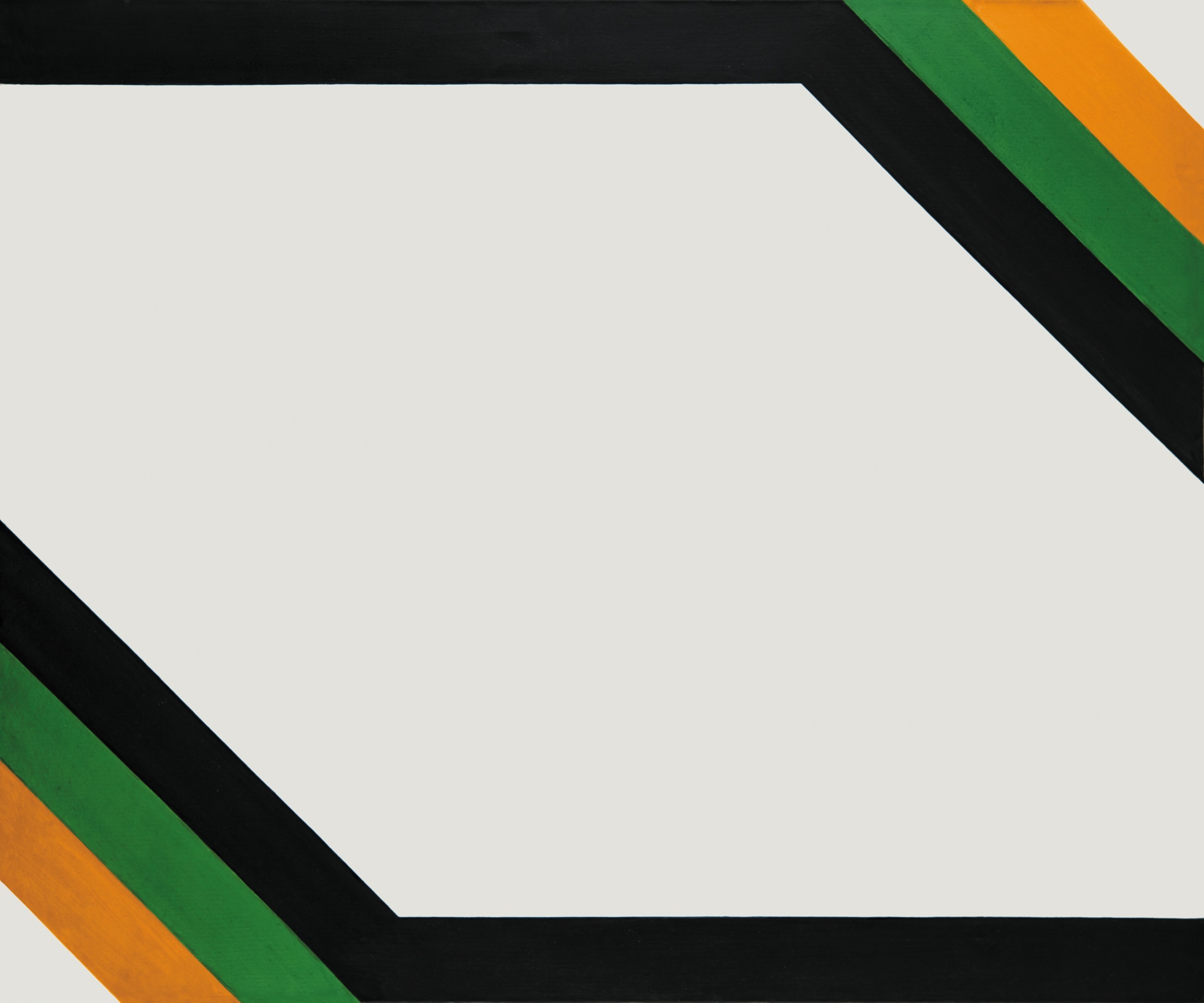 A négyzetes formátumot még megtartja, de a fehéren vagy üresen maradt sarkok és képszélek, valamint a lezáratlan, elnyúló, máskor rövidülő színsávok már a formázott vásznak felé mutatnak.