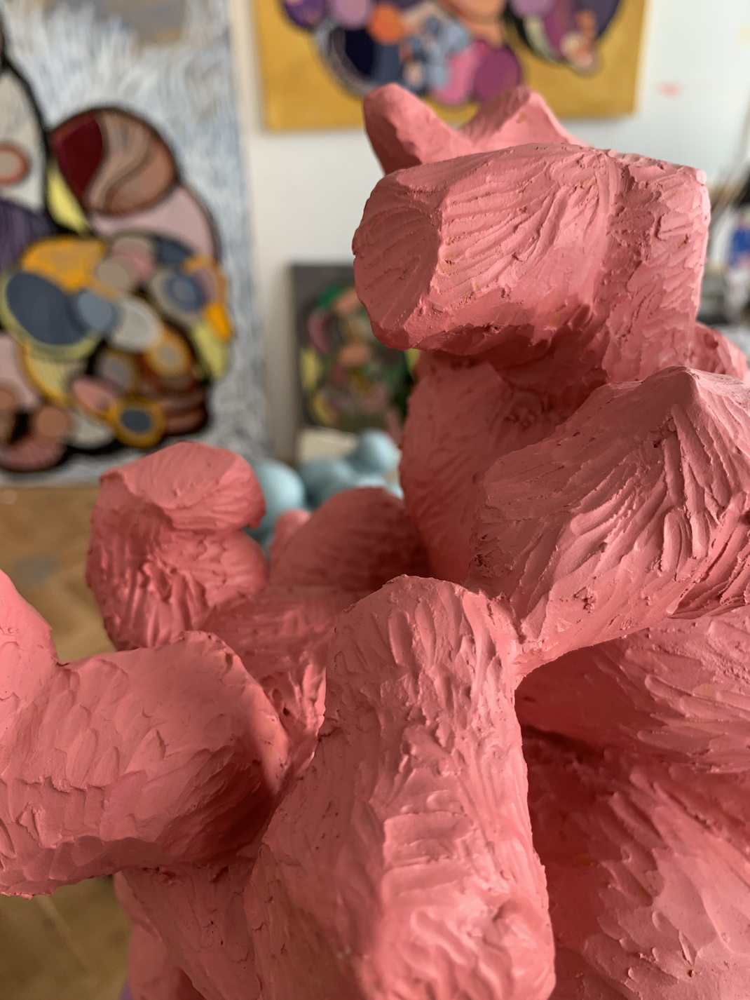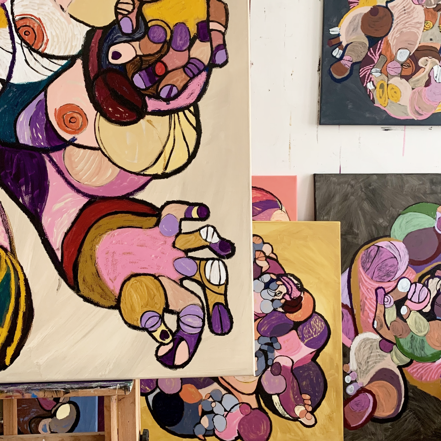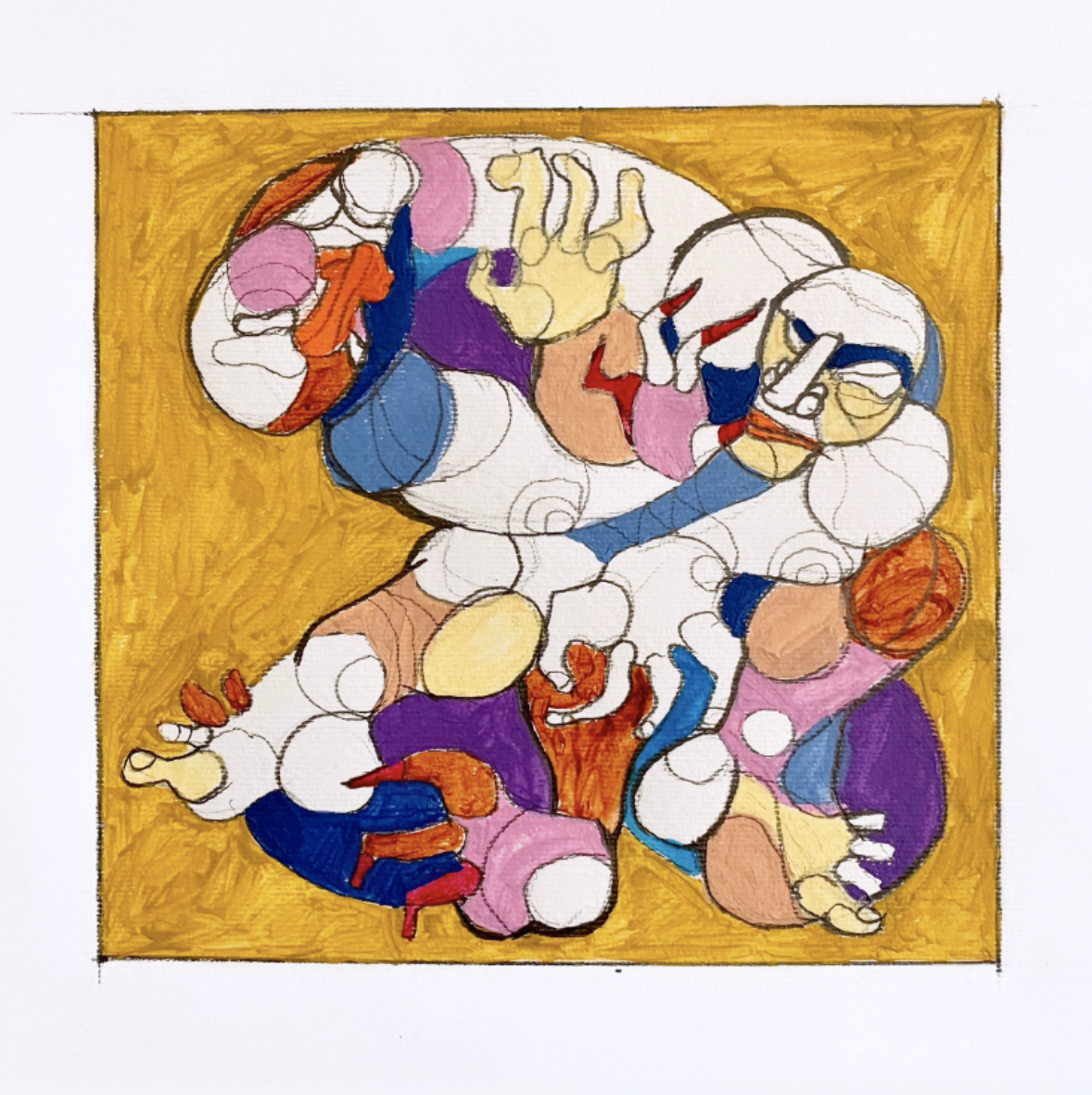 Végtagjaik és torzóik összecsomósodva, nemi besorolhatóságukat megtagadva tudatosan viselik az elsődleges és másodlagos nemi jegyek egyszerűsített formáit. A lények a monokróm felületek előtt szüntelenül egymásba kapaszkodva, gabalyodva, szerelemben egybe- és összeolvadva, az elválást nem ismerve birkóznak a küzdelem és az ölelés határvonalán. Az izomzatuk élénk színeit vastag olaj stickkel megrajzolt körvonal veszi körül, ami összhangban van az anyai méhben megtapasztalható biztonsággal és elkülönüléssel.