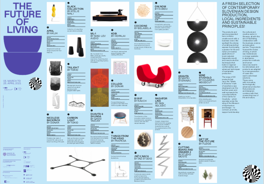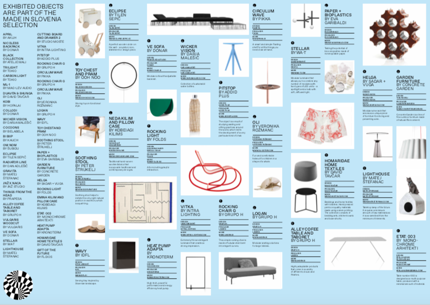 A „Made in Slovenia” védjegyet a szlovén Építészeti és Design Múzeum irányítása alatt működő kreatív központ hozta létre, és az elmúlt két évben kilencven terméket ismertek el vele, melyek funkcionálisak, ugyanakkor kifejezik az alkotók élet és természet iránti szenvedélyét, a helyi anyagokból (különösen fából) innovatív módon készülnek, valamint olyan új gyártási technológiákat alkalmaznak, melyek a regionális kézművességre és a fenntartható termelés technikáira építenek.