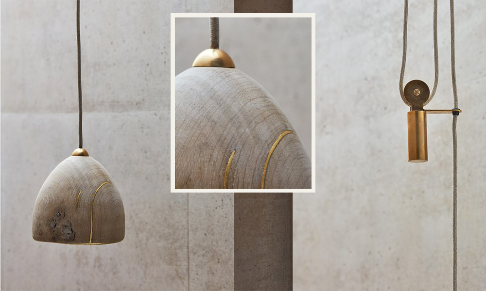 Az OCHRE Surya harag alakú függesztett lámpája egy igazi műremek. A lámpabúra tölgyfából készült, melyben a természet alkotta repedéseket 22 karátos arannyal töltötték ki. A technika a japán Kintsugin, azaz a törött kerámia javításának (a japán mesterek esetében arannyal) művészetén alapul, melynek a filozófiai lényege, hogy a tárgy sérülését nem hibaként, hanem hangsúlyozandó díszítőelemként kezelik.