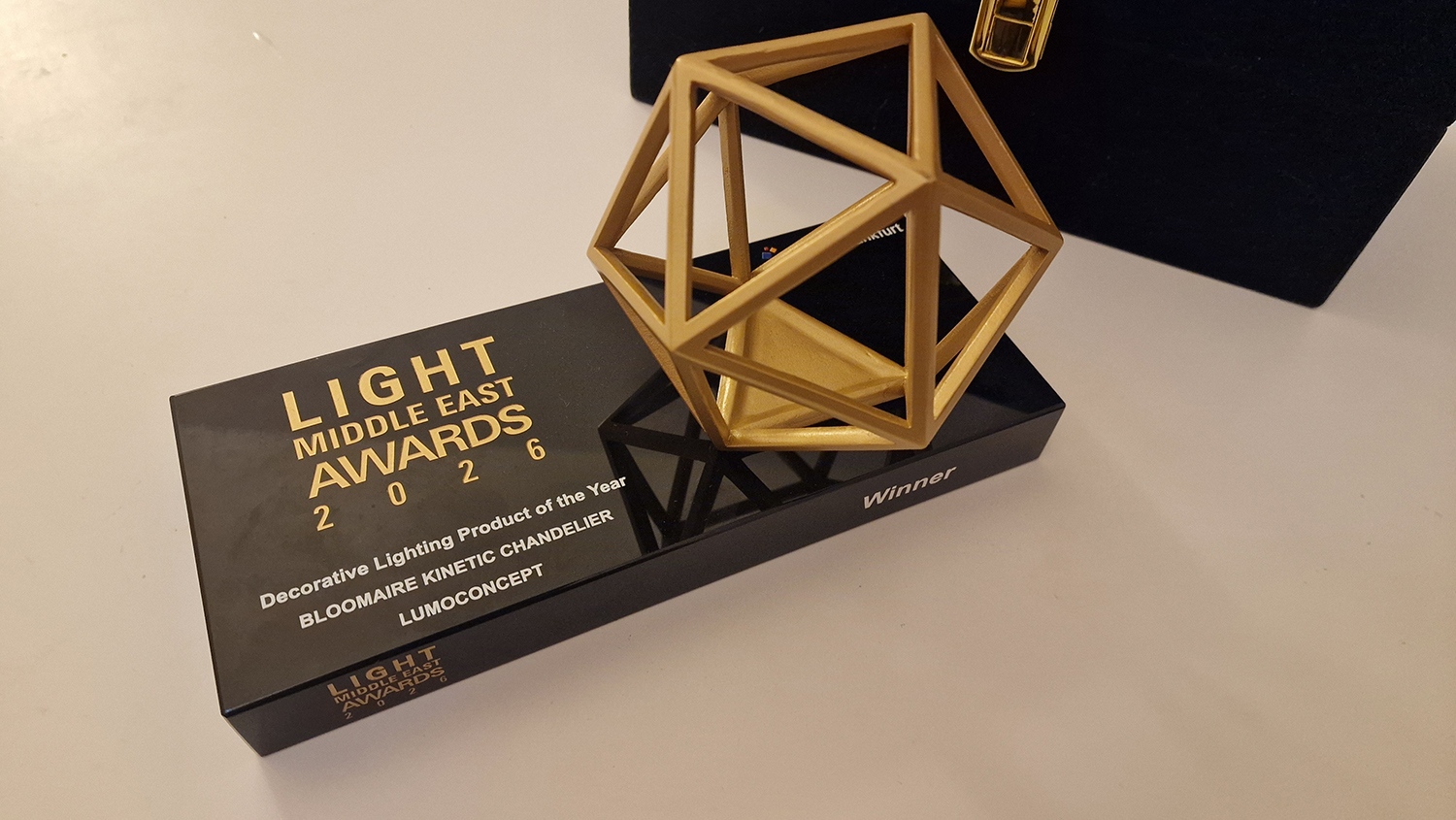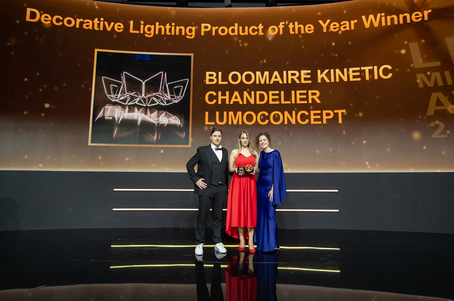 A program három fő kategóriára – Project of the Year, Product of the Year és Partner of the Year – épült, a nyertesek között közel-keleti éttermek, hotelek, kulturális és vallási terek, valamint a kölni dóm nemzetközi projektje is szerepelt. A LumoConcept a díjnyertes Bloomaire kinetikus csillár mellett az ONYX AETHER étterem egyedi világítási projektjével is bejutott a döntőbe, így a magyar vállalkozás két kategóriában is szurkolhatott az Egyesült Arab Emirátusokban.