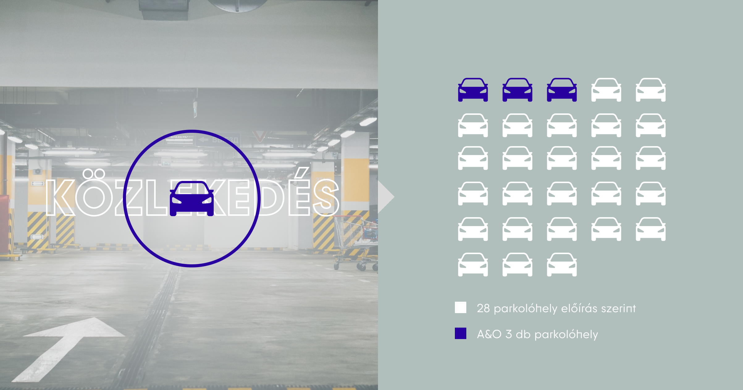 A jelenlegi szabályozások szerint az irodaterületre az alapterület alapján 28 parkolóhely létesülhet. Ezzel szemben az Allen&Overy mindössze három parkolóhelyet bérel, és azokat is elsősorban a telekocsizók számára tartja fent, ösztönözve ezzel a tömegközlekedés és kerékpár használatát munkavállalói és vendégei számára.