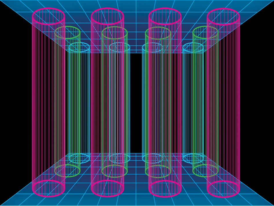 Alkotásaiban a vonalak (koordináták) száma határozza meg a formák és a határolt terek dimenzió értékét, amely a térbeli pontok összekötéseiből jön létre. Ha összekötnénk az összes Univerzumban található objektumot képzeletbeli vonalakkal, azok meghatározott formákat és tereket hoznának létre – és ha azokat részben vagy egészben kitöltjük anyaggal, úgyszintén meghatározott terek és formák képződnének. A két sík, mint azonos referenciarendszer mellett jelen van itt egy új koordinátákkal, új téri testet leírt referencia, ami egyfajta körmozgás eredménye.