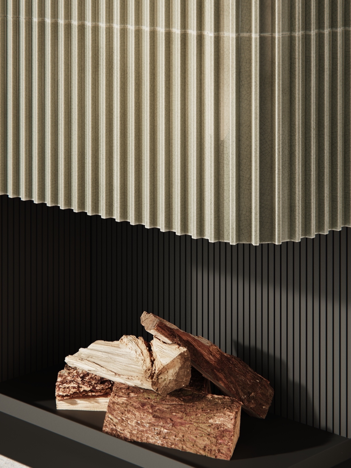 Most kézbe vesszük a hosszúkás, bordázott, súlyos csempéket. A bordázat funkcionális és esztétikai célokat is szolgál: „Nem egy csúcshatékony fűtőgépezet létrehozása volt a célom, hanem – kicsit ellentétben az alapvető formatervezői hozzáállásommal – most az esztétika volt a fő szempont. Vajon végleg el kell búcsúznunk a cserépkályháktól pusztán az esztétikai korlátaik miatt? Ezzel együtt a praktikum is jelen van, a bordázattal nő a hőleadó-felület és a hőtároló tömeg is.”
