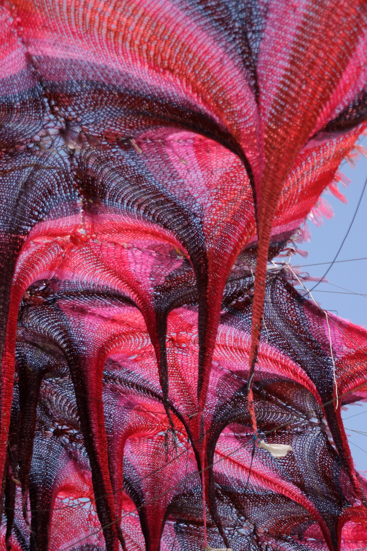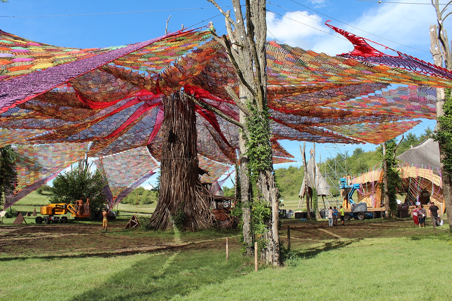 Ez minden évben egy összetett, több hónapos folyamat. Tavaly például 8000 négyzetméternyi felületet fedtünk be a Nagyszínpad fölött. Egy teljesen új, térbeli szövési formát kísérleteztünk ki. Ez egy többsíkú, organikus struktúra, ami csak ebben a kontextusban érvényes. Az anyagokat mi készítjük elő a műhelyben, az installálást pedig önkéntesekkel és egy profi technikai csapattal közösen csináljuk Ozorán.