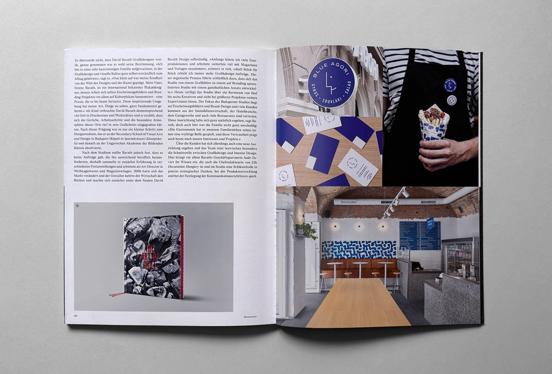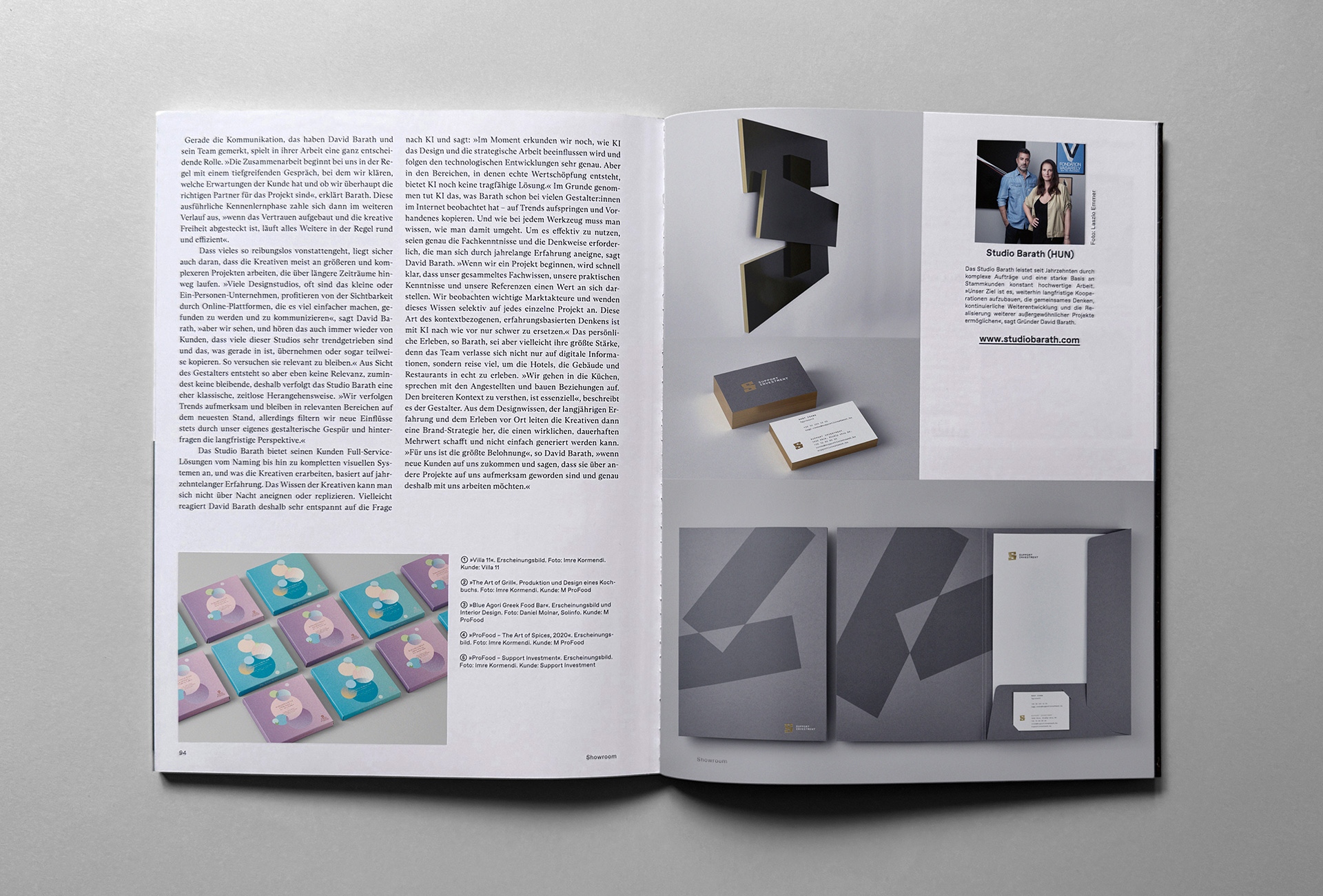 „A verbális és stratégiai feladatok a stúdió működésében ugyanolyan hangsúllyal vannak jelen, mint a vizuális tervezés. A megbízások során számos folyamatban veszünk részt – a névadástól kezdve a teljes arculat és vizuális rendszer megalkotásáig –, vagyis teljes körű szolgáltatást nyújtunk. Számos projekt már jóval a klasszikus brandingfolyamat előtt, a koncepcióalkotás vagy a termékfejlesztés lépéseivel indul. Folyamatosan fejlesztjük magunkat, és széles spektrumon követjük azokat a területeket, amelyek relevánsak a munkánkban – a luxusipartól az építészeten és belsőépítészeten át a gasztronómiáig, képzőművészetig, a kulturális eseményektől a formatervezésig, a tipográfiától a vendéglátóipari trendekig. Ez a fajta kontextuális gondolkodás különböztet meg bennünket a versenytársaktól” – emeli ki a cikkben a stúdió vezetője, Baráth Dávid.