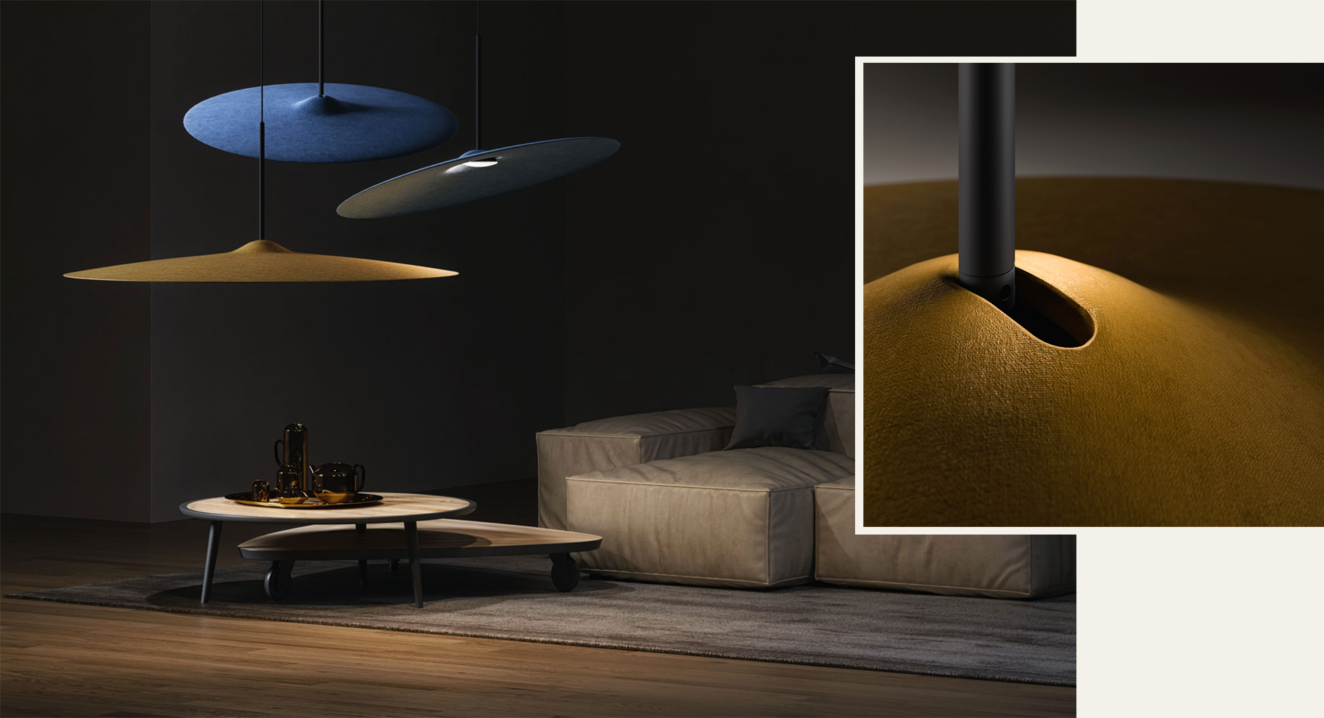 A Fabbian hatalmas cintányérra emlékeztető Acustica lámpái az eredeti funkciójuk mellett elnyelik a zavaró környezeti zajokat, ezzel magas szintű akusztikai kényelmet is biztosítanak. Dönthető pozíciójuk és könnyed megjelenésük pedig lehetővé teszi a lámpák dinamikus és kreatív elrendezését, melynek köszönhetően remek választás nyilvános terekhez, például éttermekbe és luxus irodákba, valamint nagyobb méretű lounge helységekhez. (Design by Gio Minelli & Marco Fossati.)