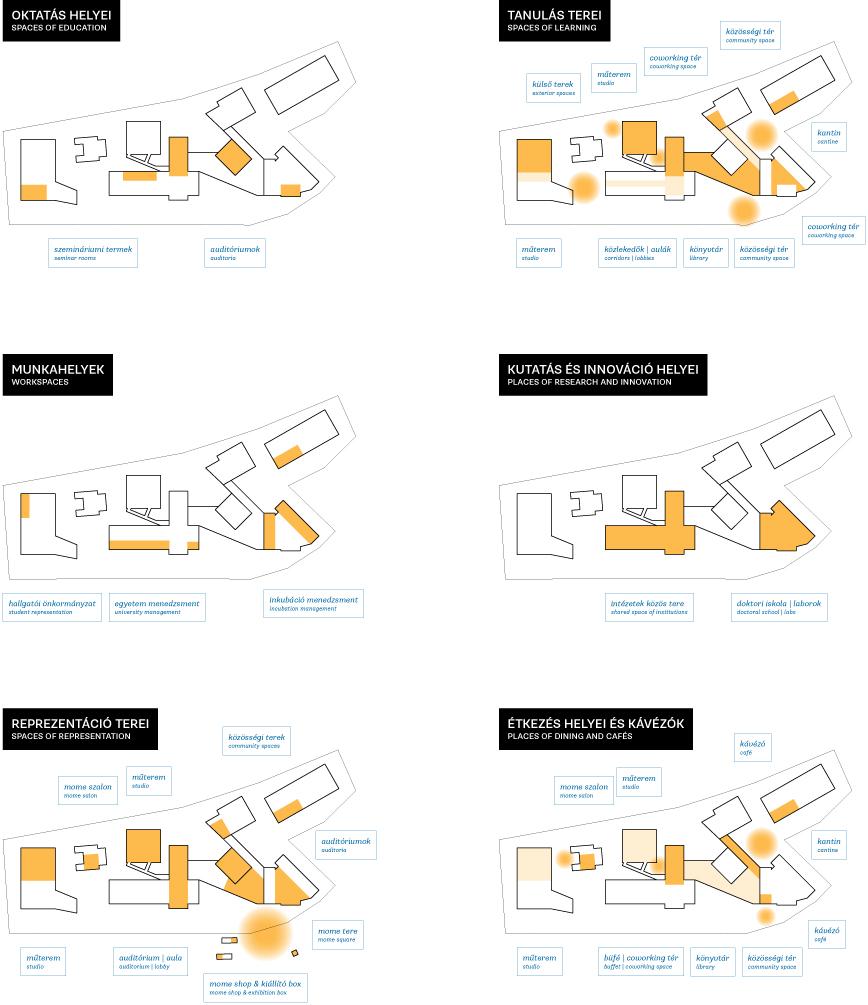 A MOME campus fejlesztésének tervezése során elsődleges célunk volt, hogy az oktatás jelenlegi tekintélyelvű struktúrái helyett részvételen alapuló, átjárható, közösségre és együttműködésre hangolt tanulási környezeteket hozunk létre. Az általunk tervezett terek nem zártak és befejezettek, hanem befogadják és kiszolgálják a felhasználót. Campus-koncepciónk egy olyan hálózat létrehozása amely az egyetem egész területét átszövi, átjárást biztosít a külső és a belső terek, tanár és hallgató, a közösségi- és az egyedüllét helyei között. Az egyes terek tiszta funkciója feloldódik, elmosódnak a funkcionális és fizikai határok, a helyiségek folyton újraértelmeződnek a velük szemben támasztott igények szerint. Ugyanúgy lehet alkotói, kiállítási vagy közlekedő tér a szemináriumi terem, a lépcsőház vagy akár a kert is."
