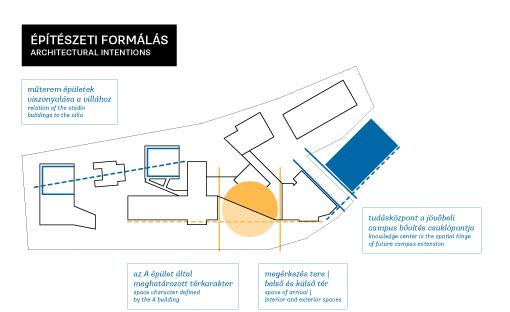 A negyedik a campuson elhelyezkedő épületek egymáshoz való tömeg és téralakítási viszonya. A meglévő és az új épületek együttes ritmusa jelölte ki az egymástól való távolságot. A BA és MA hallgatók műteremi terei szimmetrikusan közrefogják a Gondűző épületét, az MA képzés emeleti műtermeinek előreugrása pedig a villa tornácára ad választ a kerti tó által teremtett mikroklíma lezárásával.