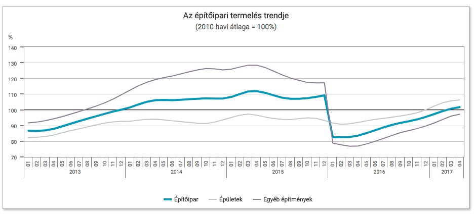 2017 áprilisában az építőipari termelés volumene 22,1%-kal meghaladta az egy évvel korábbi, alacsony bázist. Mindkét építményfőcsoport termelése emelkedett: az épületek építése 11,9, az egyéb építményeké 40,2%-kal. A szezonálisan és munkanaphatással kiigazított indexek alapján áprilisban az építőipar termelése 2,6%-kal csökkent az előző hónaphoz képest.