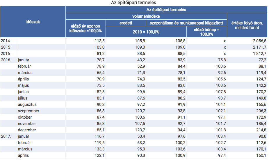 2017 áprilisában az építőipari termelés volumene 22,1%-kal meghaladta az egy évvel korábbi, alacsony bázist.