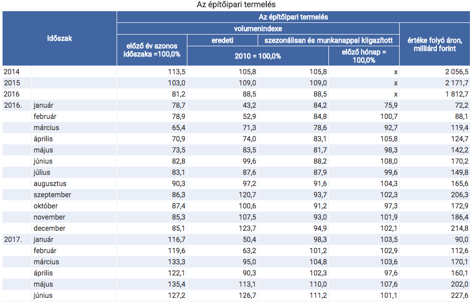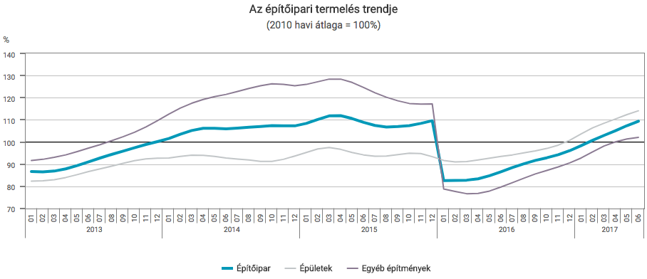2017 júniusában az építőipari termelés volumene 27,2%-kal meghaladta az egy évvel korábbi, alacsony bázist. Mindkét építményfőcsoport termelése emelkedett: az épületek építéséé 26,1, az egyéb építményeké 29,6%-kal. A szezonálisan és munkanaphatással kiigazított indexek alapján júniusban az építőipar termelése 1,1%-kal bővült az előző hónaphoz képest. A II. negyedévben az építőipar termelői árai 4,6%-kal emelkedtek az előző év azonos időszakához viszonyítva.