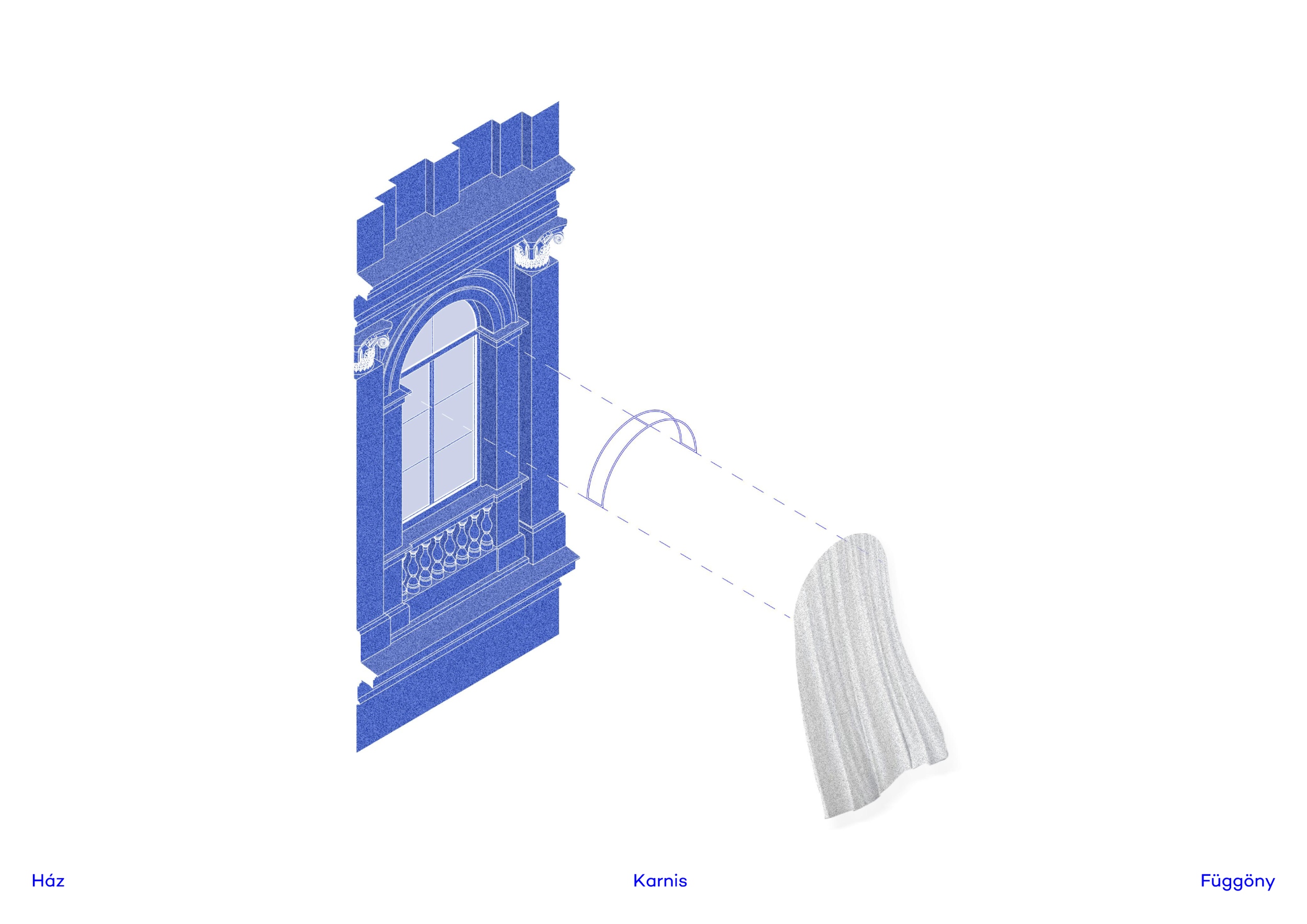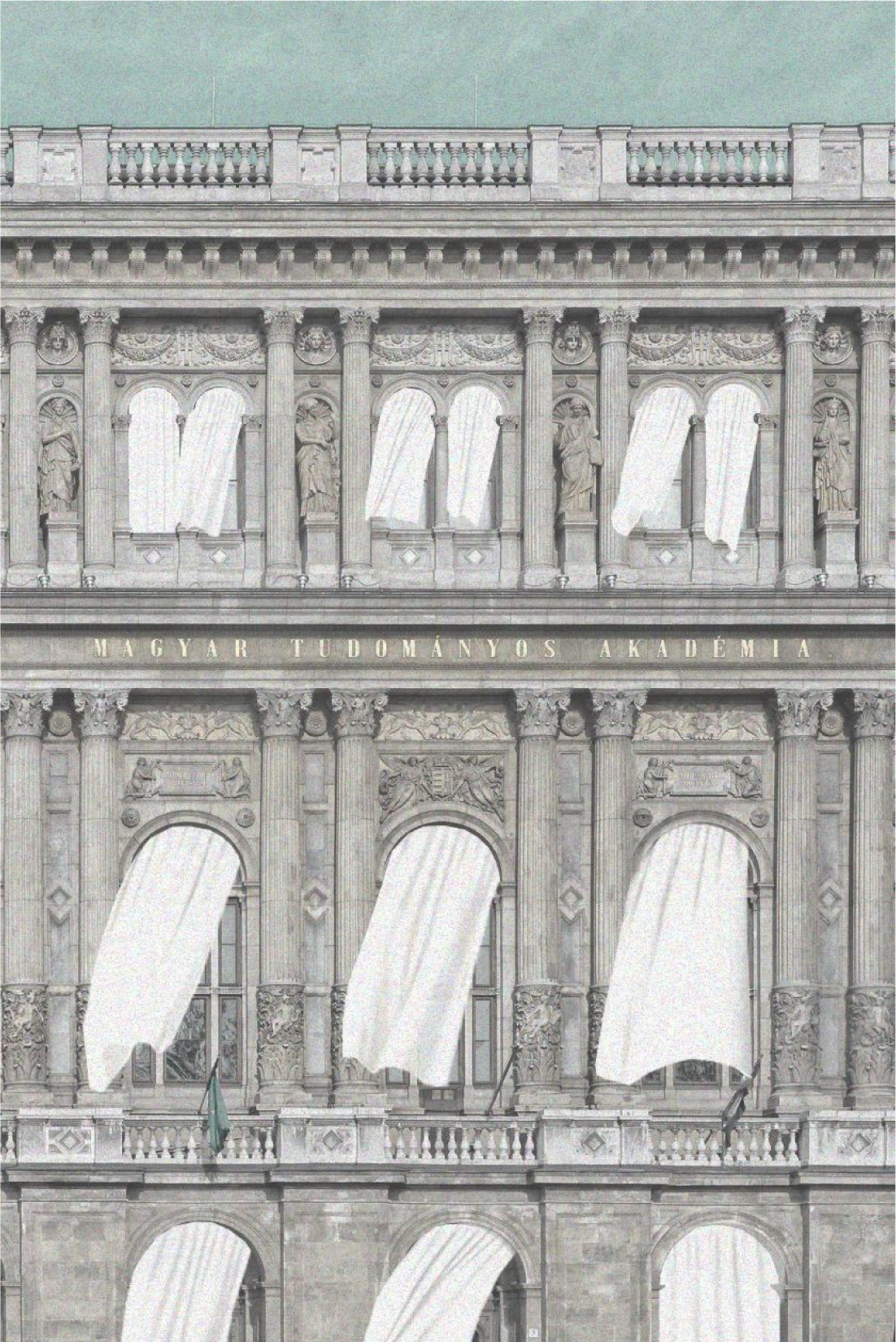 A Magyar Tudományos Akadémia székházának külső homlokzatain 305 darab ablak van, a 305 ablakra kerül 305 függöny. A függönyök anyaga tiszta fehér, könnyű, lágy újrahasznosított szövetből készül, széleit egyszerű orsószegéssel dolgozzuk el. A függönyöket az ablakkávába feszített abronccsal rögzítjük. Az abroncsok bordázatlan betonacél rudakból hajlított és hegesztett szerkezetek, melyek roncsolásmentesen feszülnek be az ablakok kőkáváiba. Az abroncsok kinyúlnak a kávákból, a függönyöket 5 cm távolságra eltartva a homlokzatok külső síkjától, hogy a szél meglibbenthesse őket. A ház szárnyra kél.