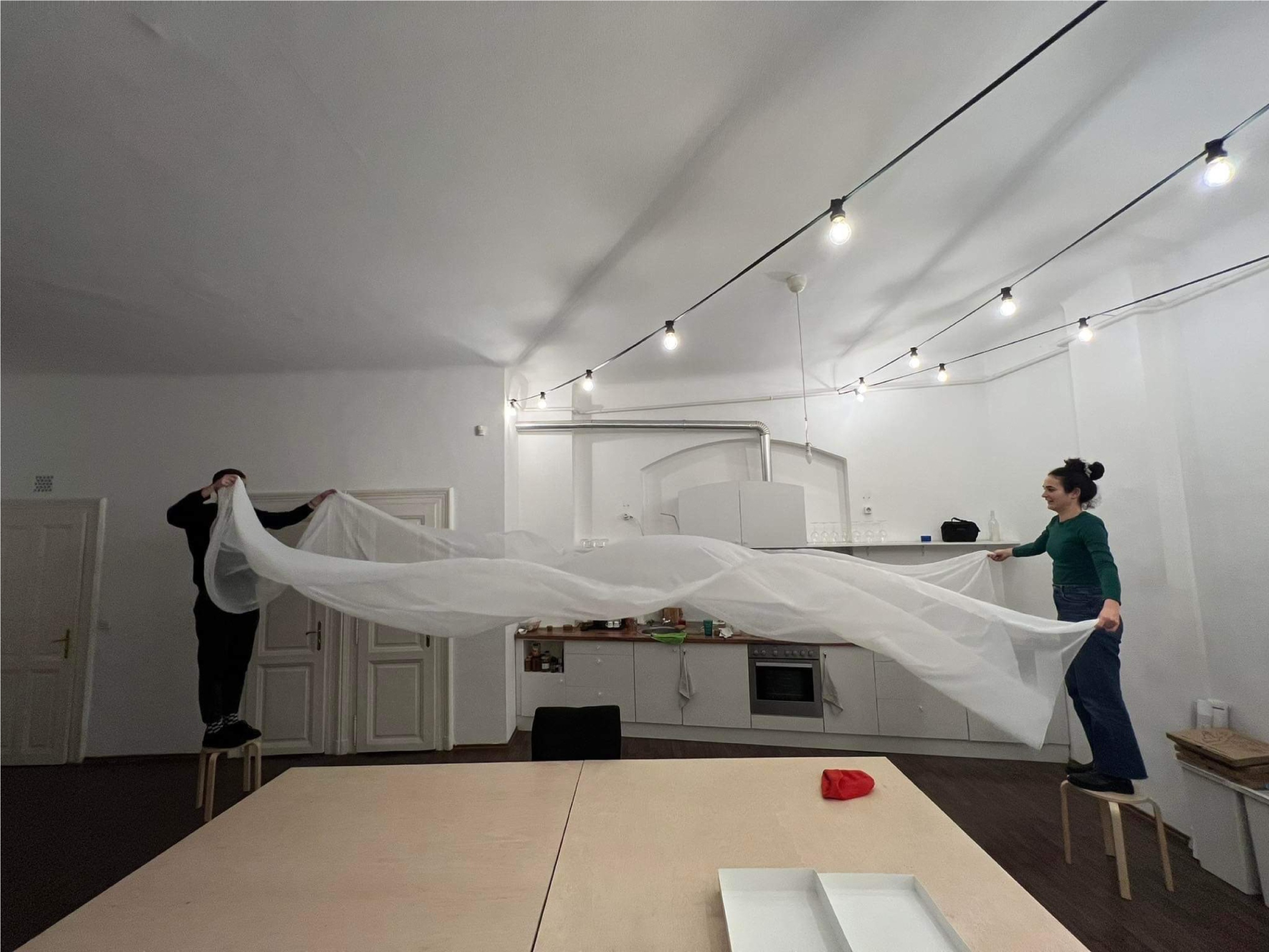 v: A helyzetükből következik majd. A házak „közönséges” függönyei az ablakokon belül vannak, a mi függönyeink a homlokzati síkok elé kerülnek. Szokatlan helyzetük egyértelműen utal majd sajátos, szokatlan rendeltetésükre, szerepükre. A függönyök felhelyezését és leszerelését fölfoghatjuk művészeti akciónak, eseménynek, performansznak.