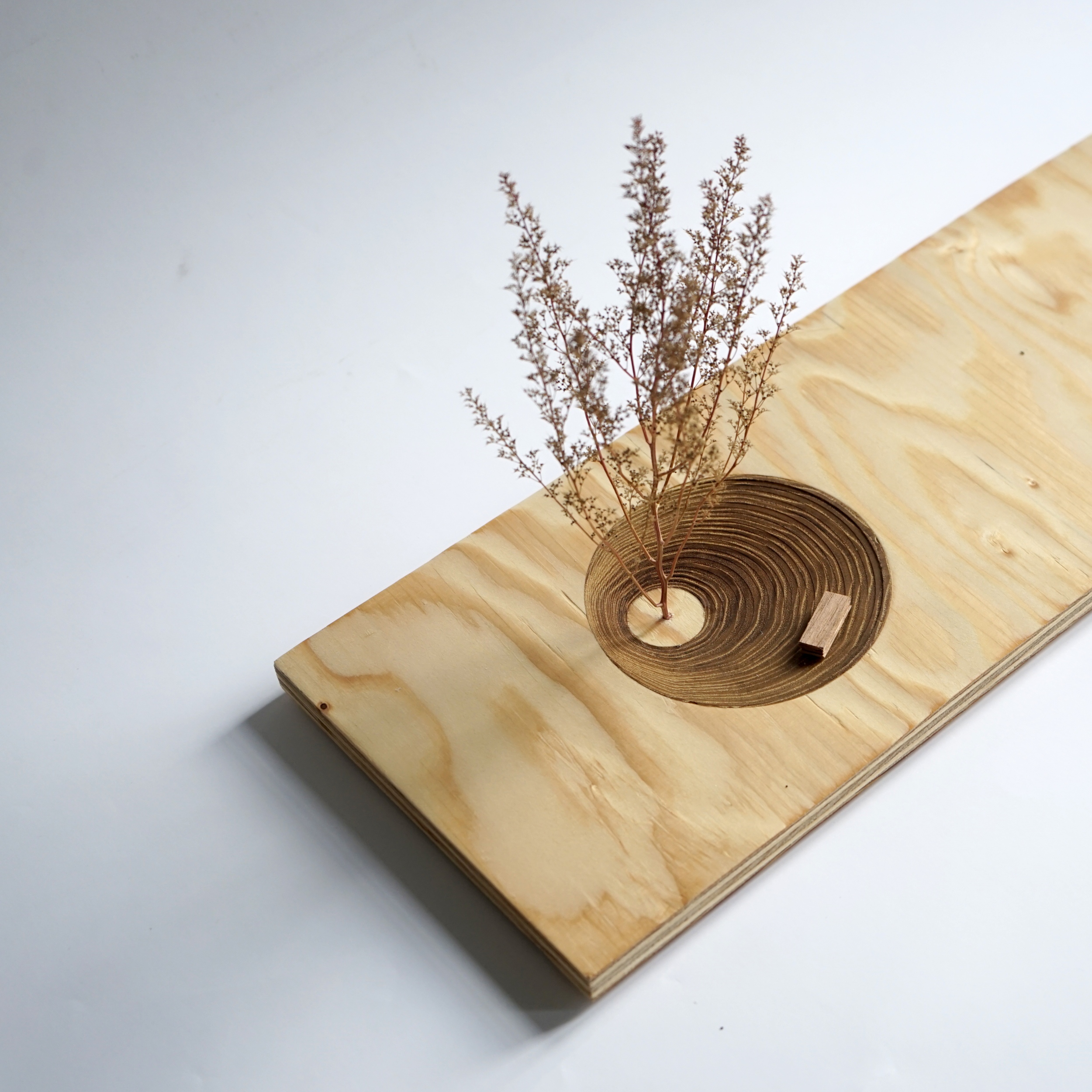 Az évgyűrűk anyaga öntött terazzo. Kettős természetű anyag: éteri-kitöltő és elemi-szórt alkotóelemek. Felületi csiszolással válik monolittá, a föld részévé. Lépcsőzése a fához terel. Gyűrűről gyűrűre készül, betűről betűre íródik.