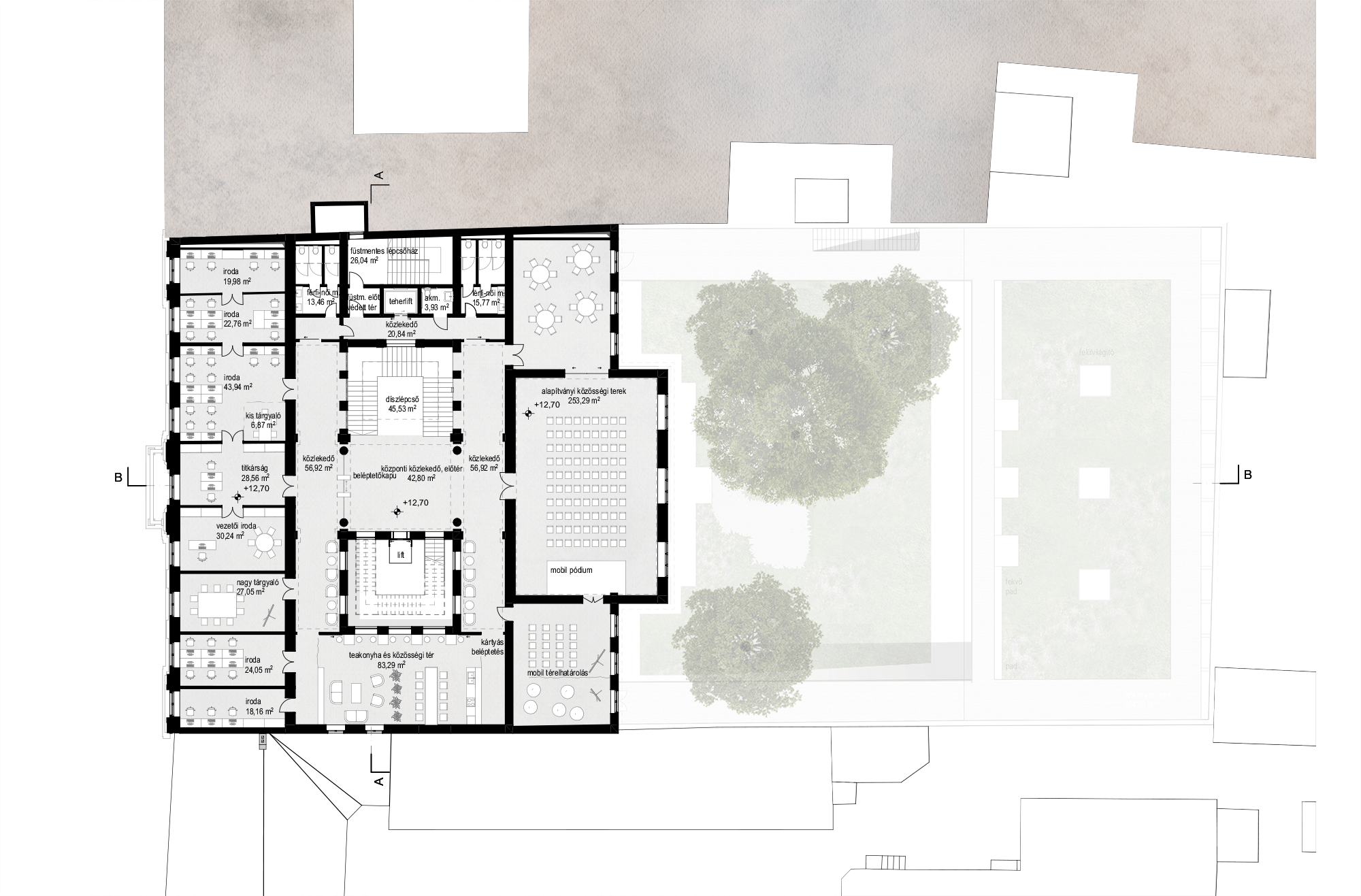 Az udvarba tervezett épületrészek teteje nagyrészt zöldtető, ahova mind az épület félszintjéről, mind az udvarról fel lehet jutni. A felső udvarrészek nyitottabb karaktert képviselnek, alacsonyabb növényzetet és fekvő padokat terveztünk ide. A lenti udvar zárt, intim világ, egy belső, védett oázis a belvárosban. Árnyékot biztosító magasabb fákkal, sűrű növényzet közt megbúvó bútorcsoportokkal, asztalokkal, székekkel ad helyet a kávézók, beszélgetők, pihenő emberek számára.