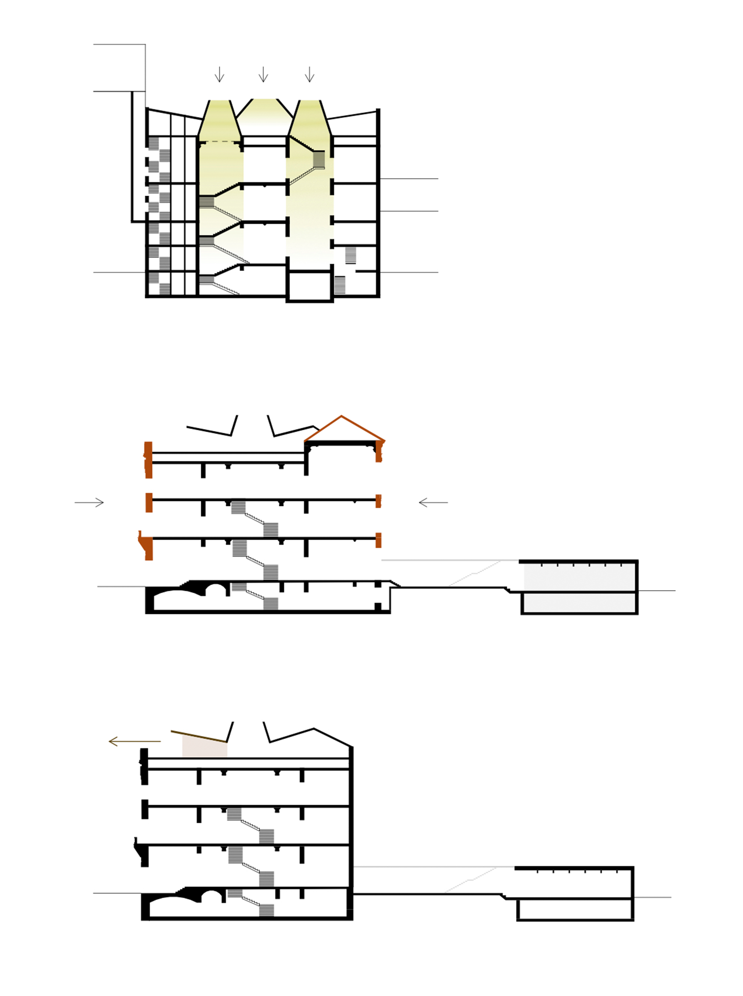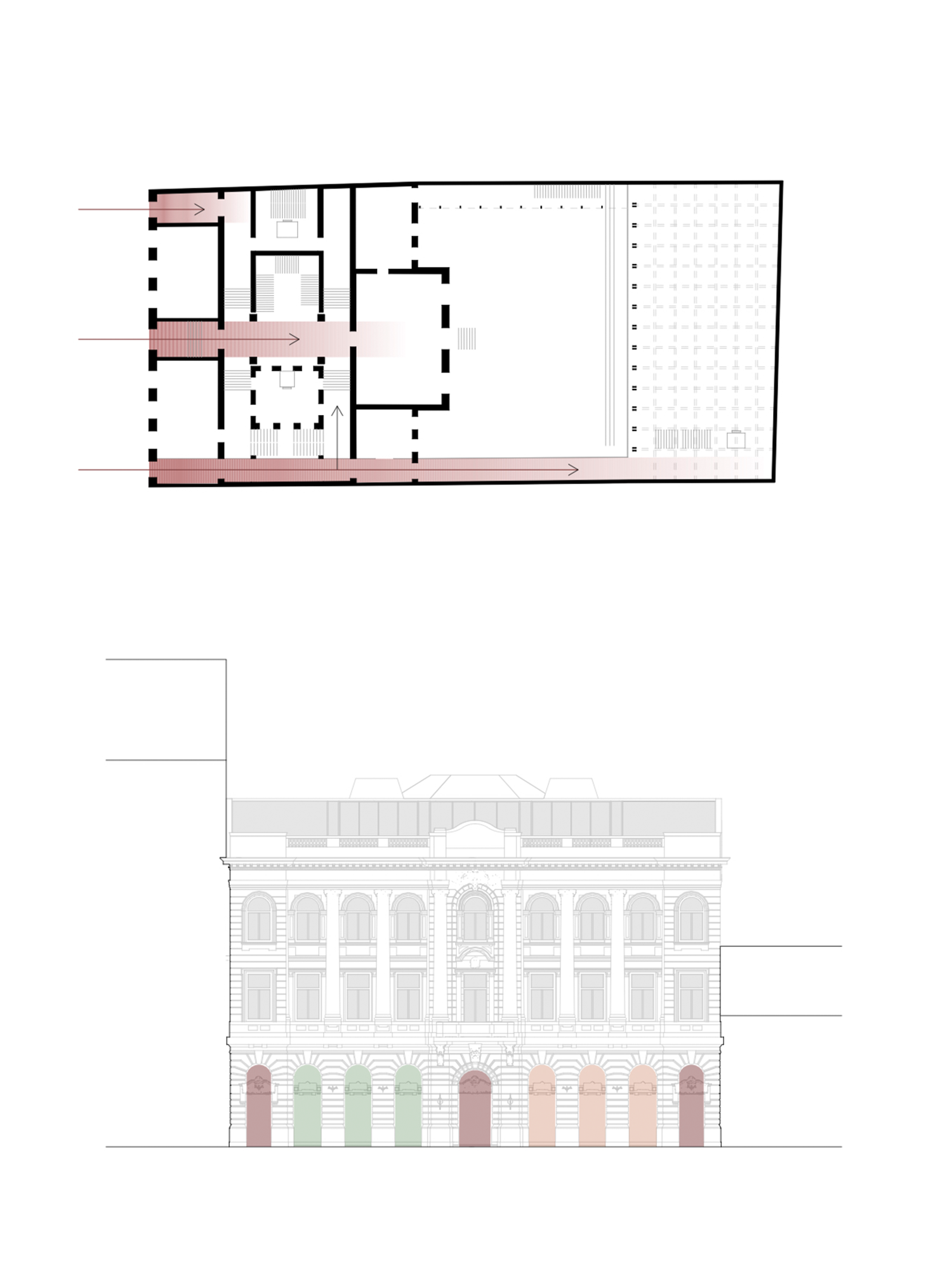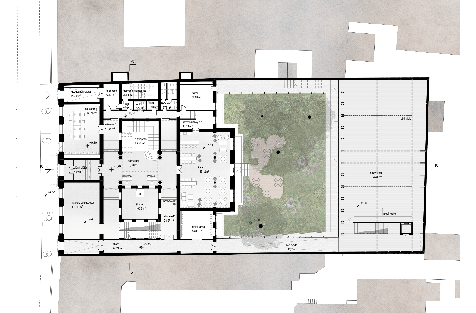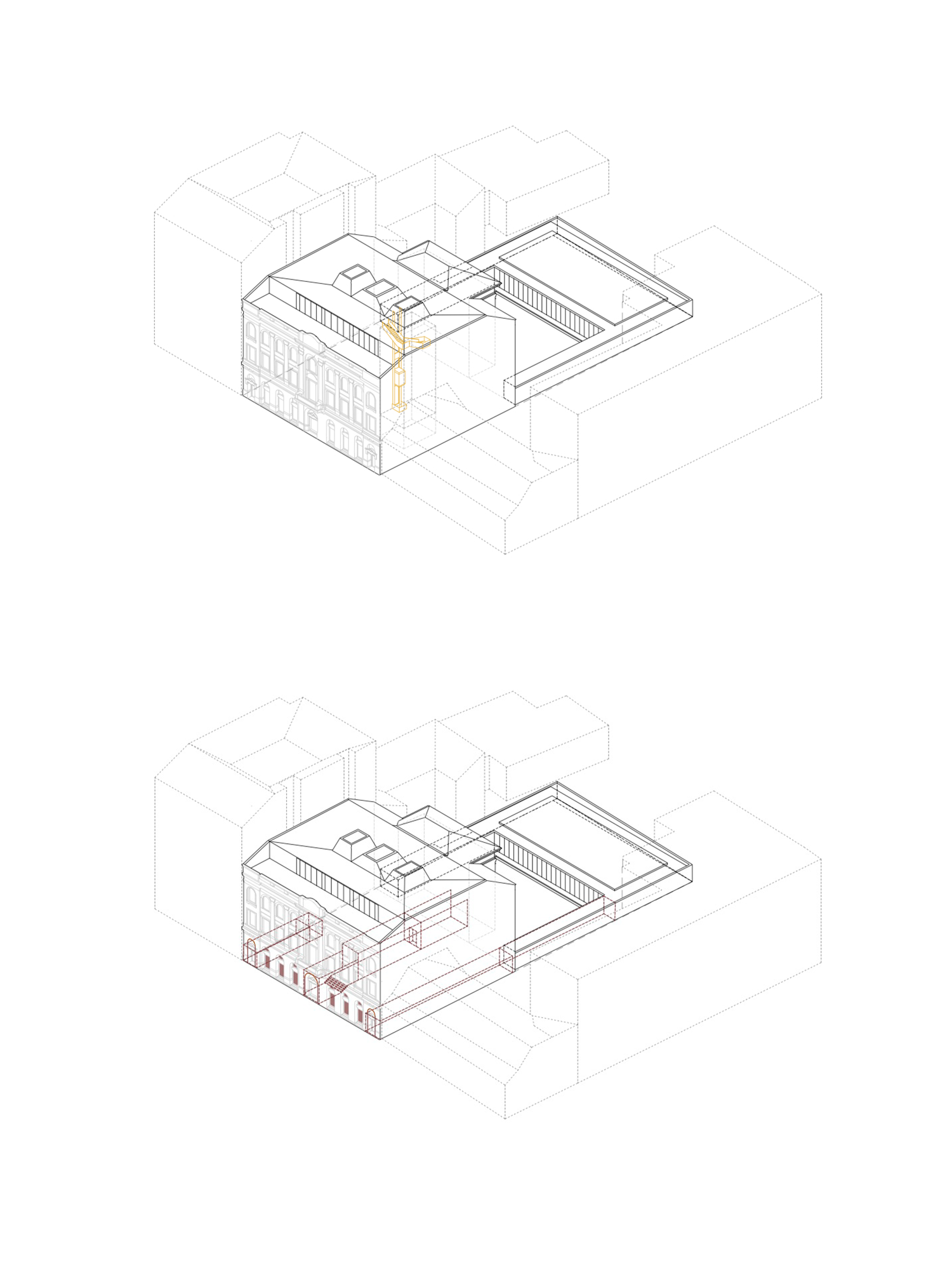 A műemléki épület főfalait megőrizzük, a jobb funkcionális tagolás érdekében pontonként ajtókkal – a szükséges kiváltásokkal együtt – megnyitjuk. A homlokzat földszinti helyiségei felett elhelyezkedő félszinti tereket galériává alakítjuk létrehozva egy nagyvonalú homlokzat mögötti térstruktúrát.