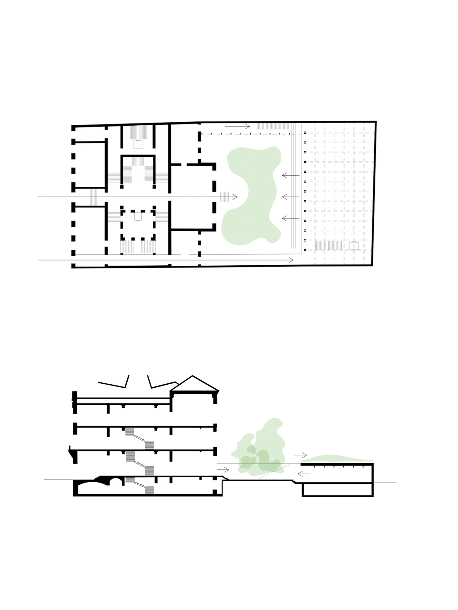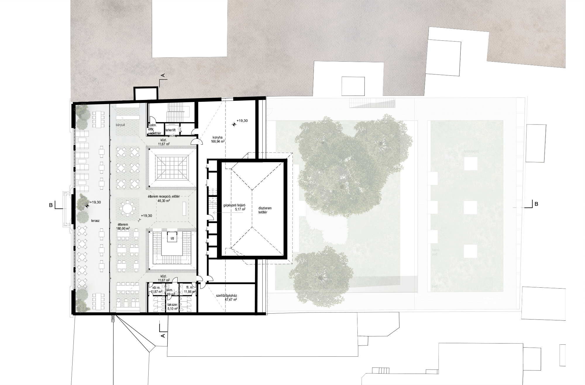 A kert megnyitása koncepcionális kérdése a tervünknek. Úgy gondoljuk, ha a kertet nem zárt falak, homlokzatok, hanem aktív felületek veszik körbe, ahonnan a bent tartózkodók könnyen ki tudnak jutni a zöldbe sokkal inkább használt, élő részét fogja képezni teleknek, az értékes felület kihasználttá válik. Ezért a rendezvénytér nagy egybefüggő terét, a telek végén helyeztük el. A pavilonszerű épületrészt csupán üvegfal és egy oszlopsor választja el a kerttől. A nagy termet a telek déli oldalán zárt, északi oldalán nyitott folyosó köti össze a főépülettel.
