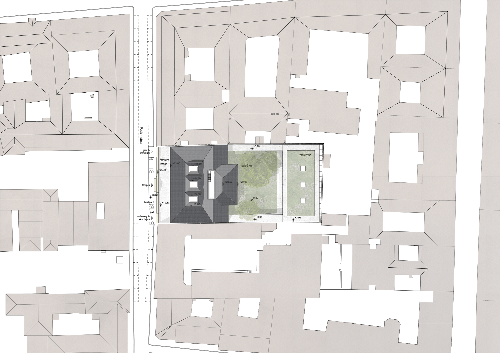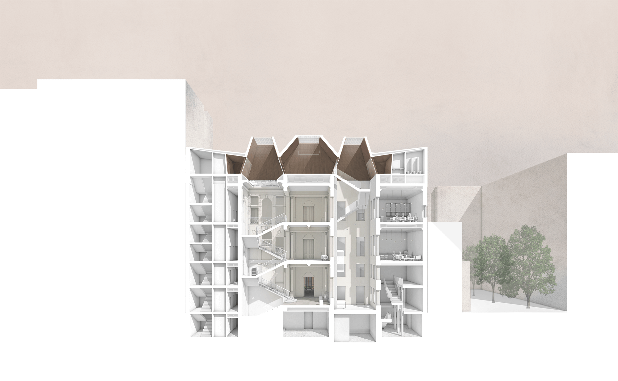 Tervünkben a tetőteret új funkcióval hasznosítjuk, mely kihasználja a Gellért hegy irányába nyíló kilátást. A tető formálásának alapját a műemléki homlokzatképzés, és a jelenlegi geometria adja. Az utcai és kerti homlokzat felől az épület karaktere nem változik, az érzékelhető homlokzati struktúrák megmaradnak. Az új tetőrészek geometriáját belső udvarok szervezik: a funkcionális elrendezést és a tengelyes szerkesztést követve tervünkben a tető szimmetrikus kialakítású, melynek a fő elemei a főlépcsőház és a belső udvar fölé nyúló bevilágító gúlák. A két tetőgúla között egy harmadik jelöli ki a szint megérkezési pontját, az éttermi fogadóteret.