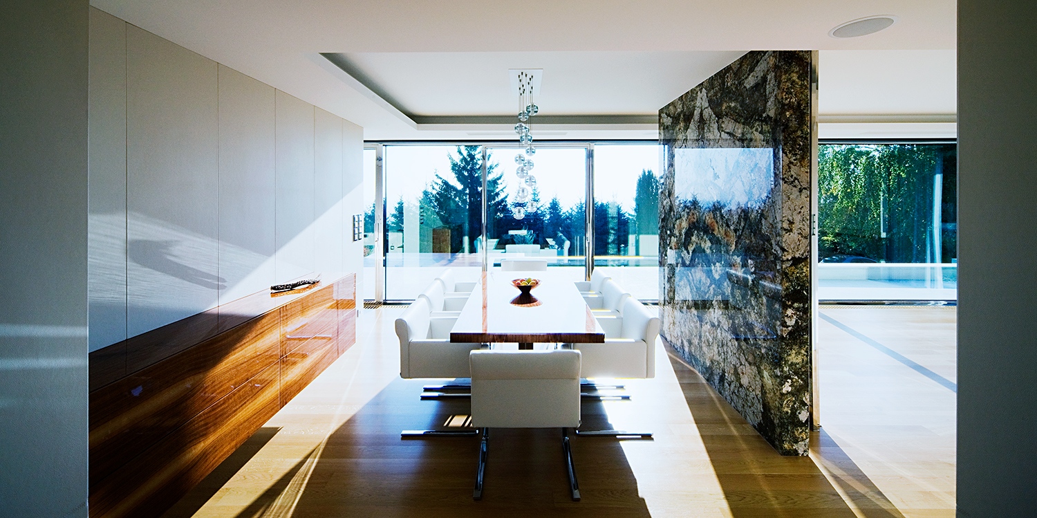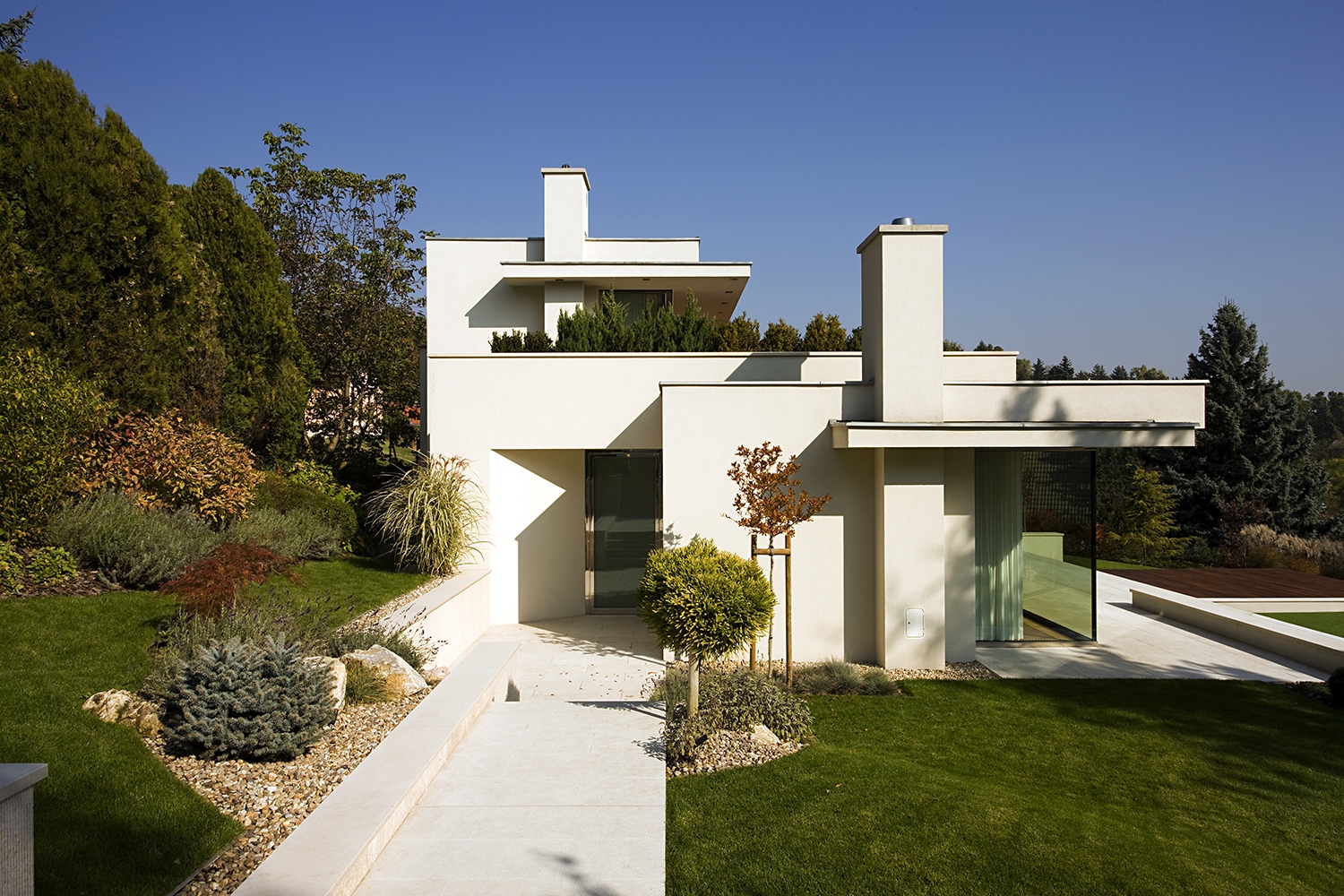 Csemege valamennyi részlet: a fal síkjába illesztett ajtótokok, a mennyezetig nyíló ajtók pontossága, a megemelt konyhapult minősége. Megragadó a nyílászáró profilok fegyelmezett, precíz, kézzel polírozott acél sora. Mindez a természettel együtt lélegző terekkel párosul, panorámára tájolt nappalival, étkező és dolgozószobával a földszinten, valamint e frontra nyíló, teraszos emeleti hálószobákkal. Korpuszában modern, tájba illeszkedő épület. Nem találni meg nem oldott, végig nem gondolt komponenst. Az utcafronti bejárati kapu szintén szobrászati műremek, a fogantyúba „égetett” tervezői szignóval.