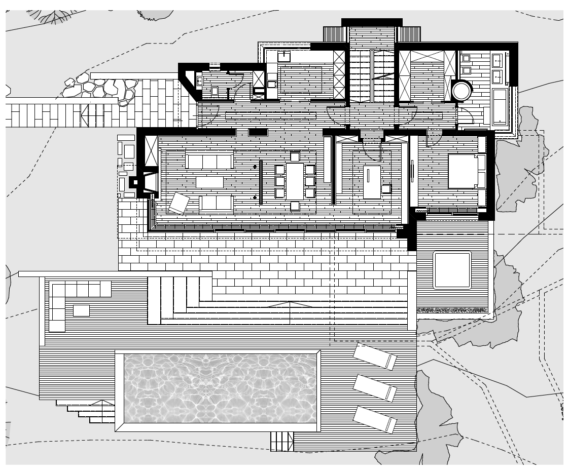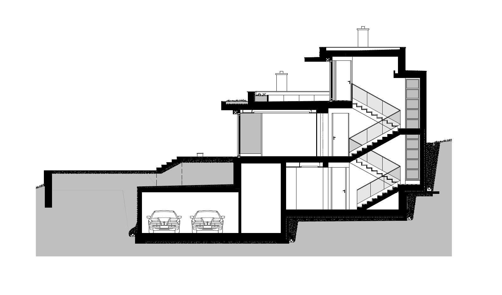 Csemege valamennyi részlet: a fal síkjába illesztett ajtótokok, a mennyezetig nyíló ajtók pontossága, a megemelt konyhapult minősége. Megragadó a nyílászáró profilok fegyelmezett, precíz, kézzel polírozott acél sora. Mindez a természettel együtt lélegző terekkel párosul, panorámára tájolt nappalival, étkező és dolgozószobával a földszinten, valamint e frontra nyíló, teraszos emeleti hálószobákkal. Korpuszában modern, tájba illeszkedő épület. Nem találni meg nem oldott, végig nem gondolt komponenst. Az utcafronti bejárati kapu szintén szobrászati műremek, a fogantyúba „égetett” tervezői szignóval.