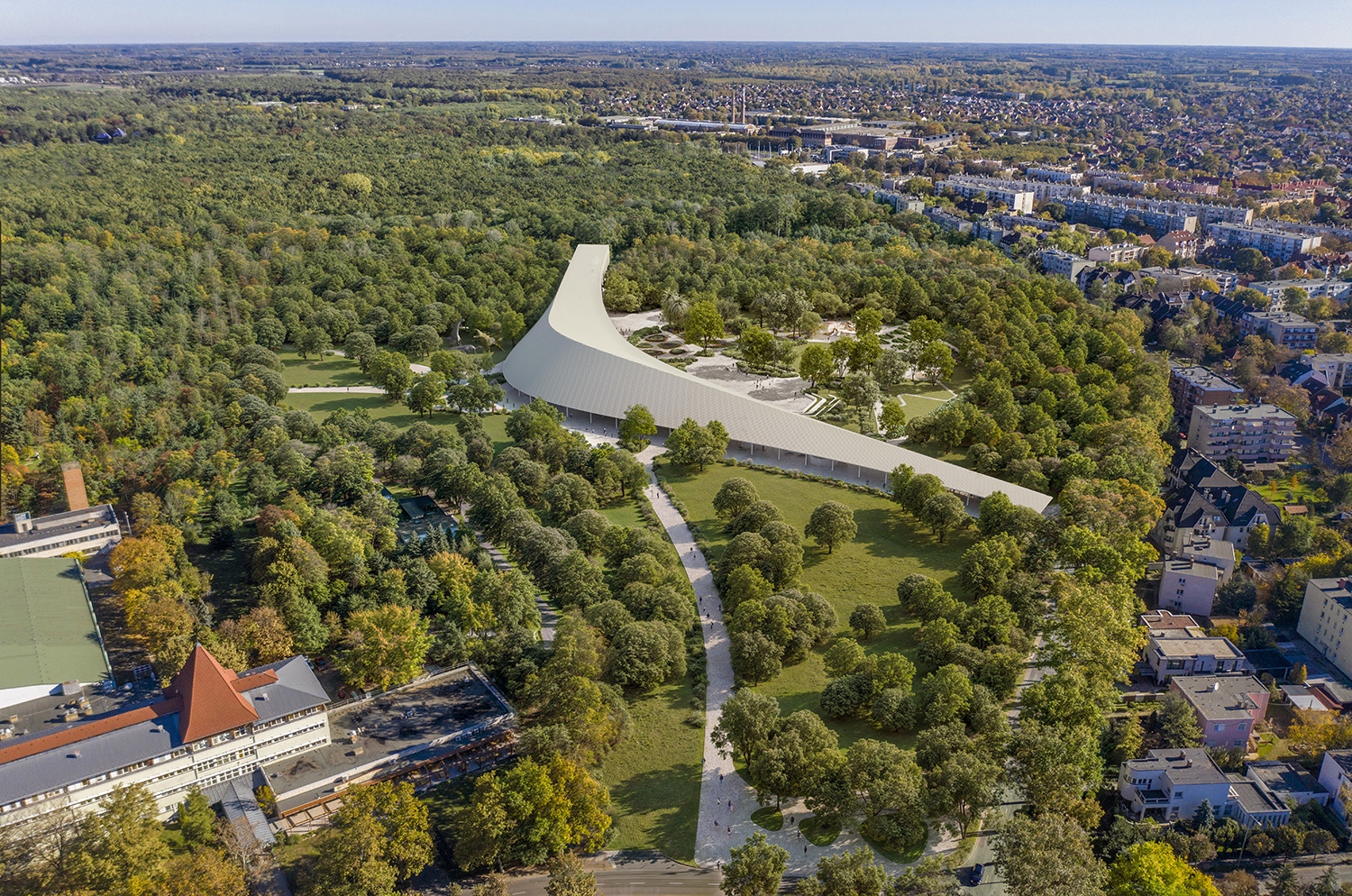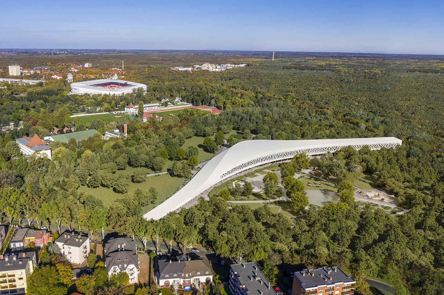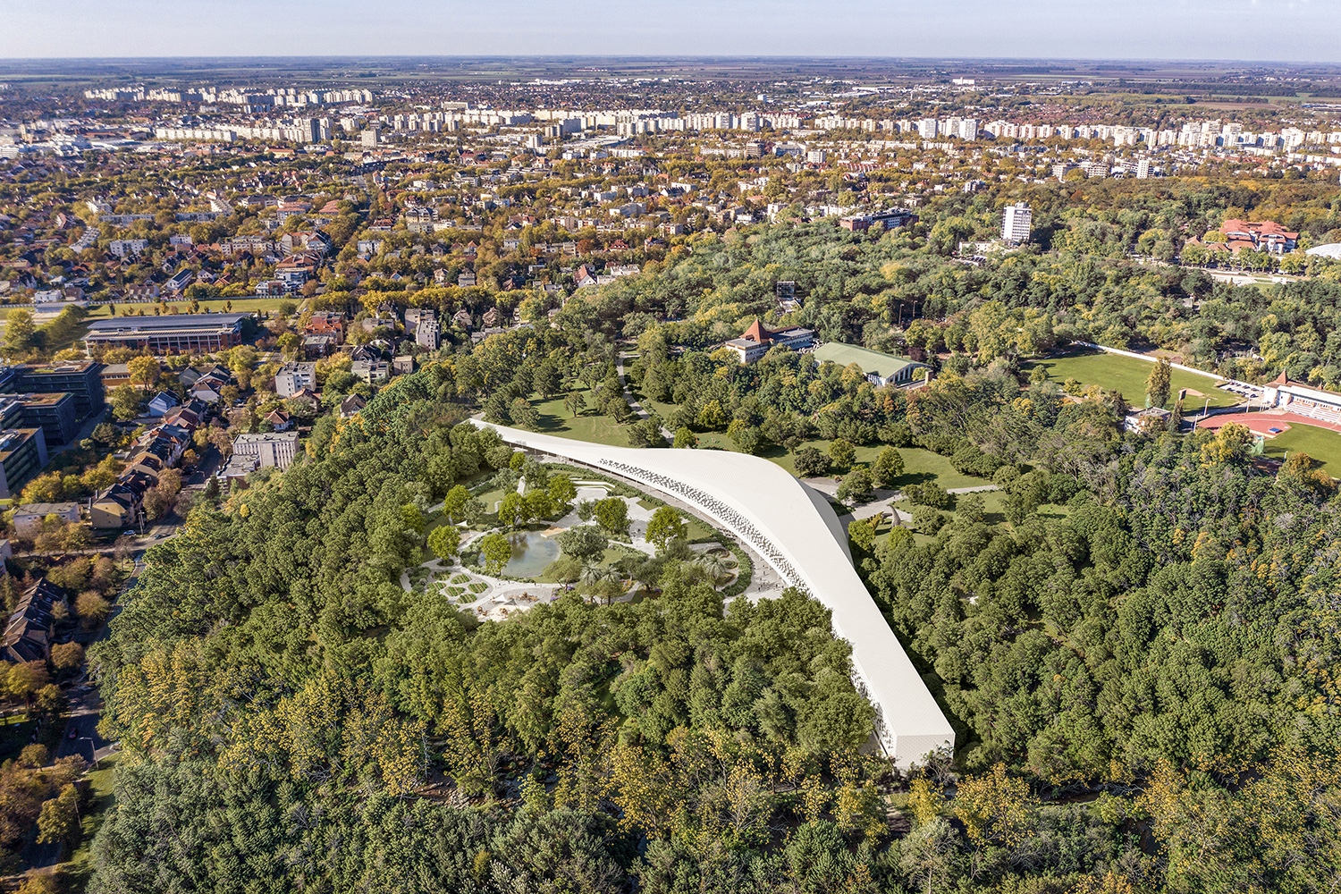 A tervezett múzeum a Nagyerdei körút közé befeszülő íves tömegformálású épület, amely a tömegképzésből fakadó csápjaival, és az idegsejt szerű gyalogos hálózatával behúzza a látogatót a terület sejtmagjába, azaz a központi előcsarnokba. Az épület íve a fő megközelítési irányokat köti össze, erőteret hozva létre a ház előtt, és védettebb fókuszpontot a ház mögött. Ennek megfelelően a közösségi városi park az épület elé, míg a jeggyel látogatható belső kert az épület mögötti fókuszpontba, az erdőbe integrálva került. Az épület előtti tér nyitottabb, átláthatóbb, ligetes, míg az épület mögötti terület az eredeti állapotot megtartva zártabb, védettebb, erdős.