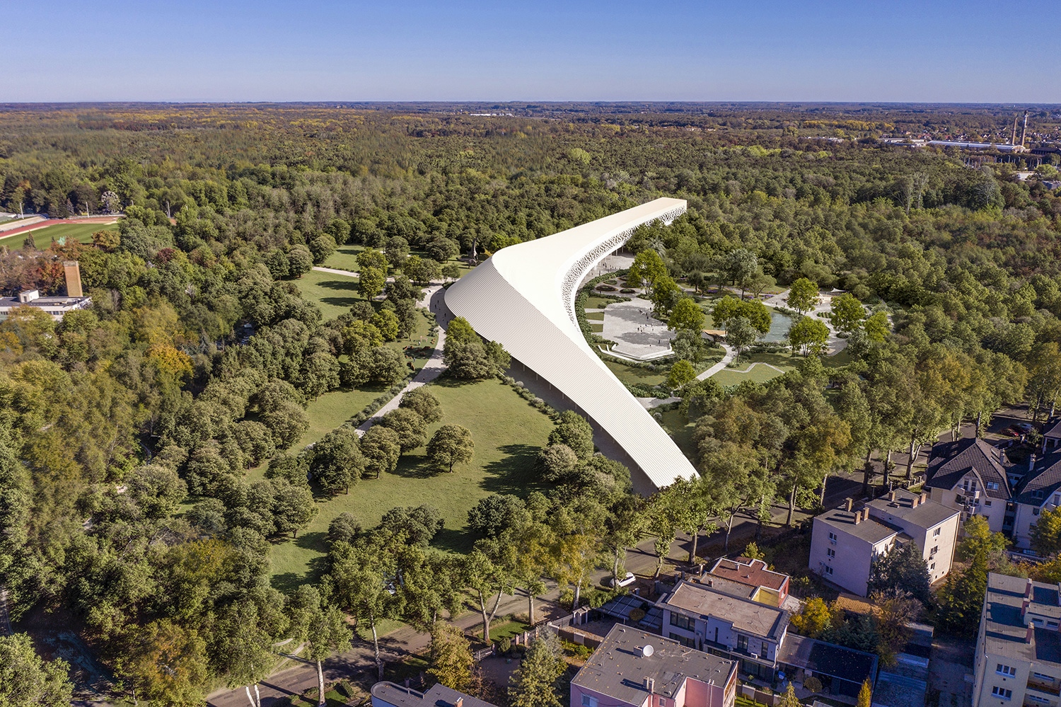 Az épület tömegformálásában fontos szempont volt az épület előtti és az épület mögötti tér közötti vizuális és fizikai kapcsolat, a szabad átjárhatóság. A természeti formák ihlette, vagy azokat idéző áramvonalas csavart tetőforma a lombkorona szinten „lebeg”, alatta néhány zárt, de jellemzően transzparens forma biztosítja a környezetével a funkcionális kapcsolatot. Déli irányból lapos előtetőként indul a tetőforma, ami a terület közepe felé haladva magasra emelkedik, egy törő él mentén az erdő felé homlokzatként viselkedik, majd lassan egy hasábbá alakul a forma, ami a terület túloldalán az erdő közül kibukkan.