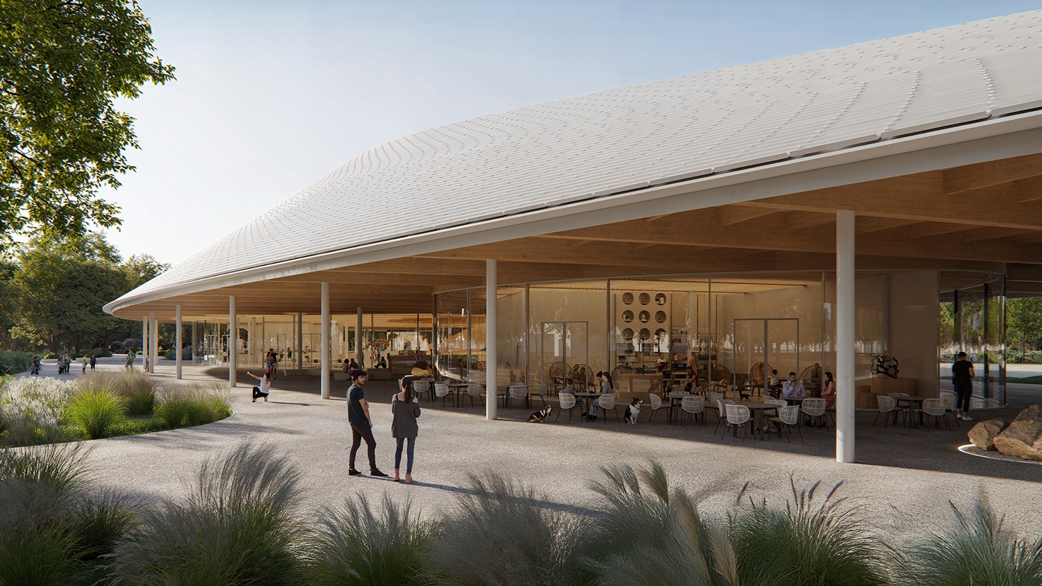 Valamennyi fogyasztótér ki tud települni a nagy tetőforma által fedett területre, élővé, nyüzsgővé téve azt. Mindezek a funkciók bárki által elérhetők, a múzeumtól függetlenül üzemeltethetők, tulajdonképpen a múzeumi látogatók mellett a városlakókat illetve a közparkba és az erdőbe érkezőket is szolgáló pavilonok. Három autóbusz számára a drop-off pontot a terület dél-nyugati részén az Oláh Gábor utca mentén helyeztük el.