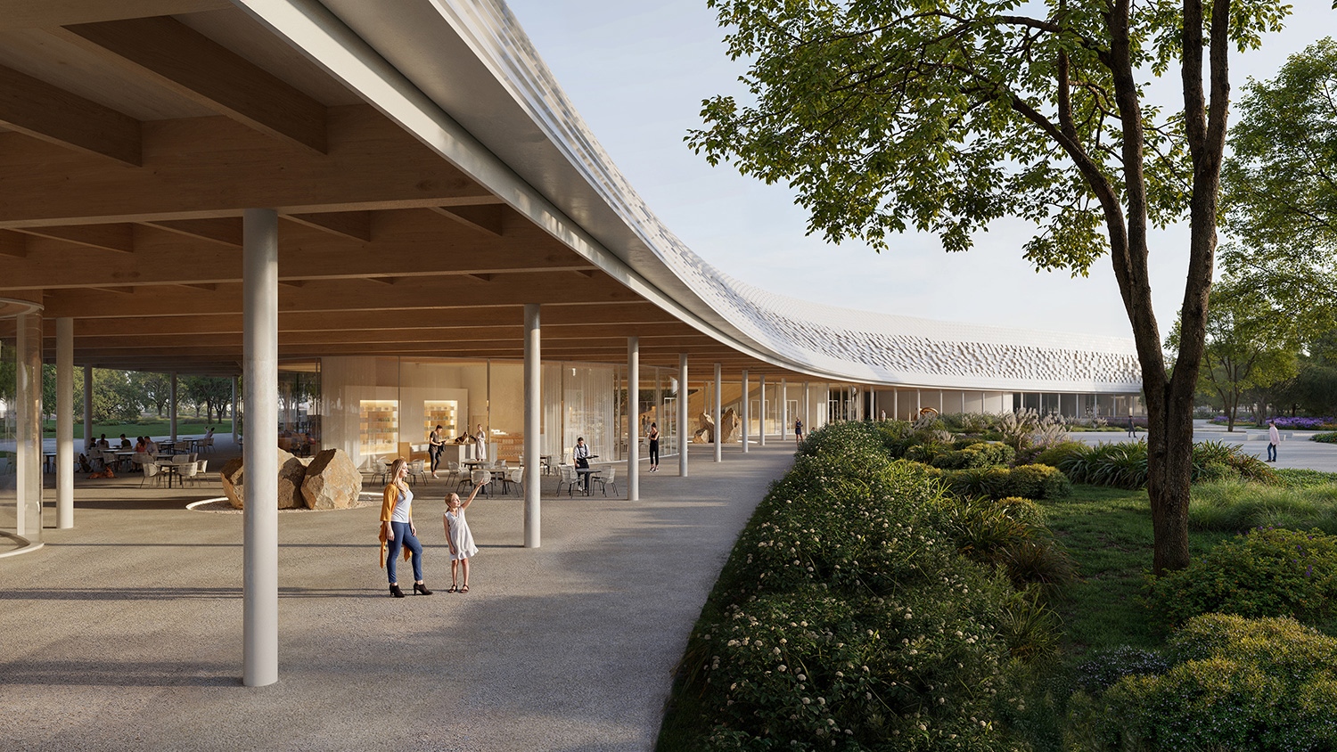 Az alapvetően tömör tetőforma fehér kerámia burkolatú, amely ha a mögöttes funkció úgy igényli fokozatosan kiritkul, áttörtté válik, így természetes fényt enged be a házba. A tető alatti funkciónként különálló lekerekített buborék formák üveg homlokzatúak, kivéve az áruszállítást szolgáló buborék formát, ami tömör fehér homlokzatú. A tető alátámasztását karcsú fehér acéloszlopok adják, amelyek a fák törzseinek ritmusát idézik.